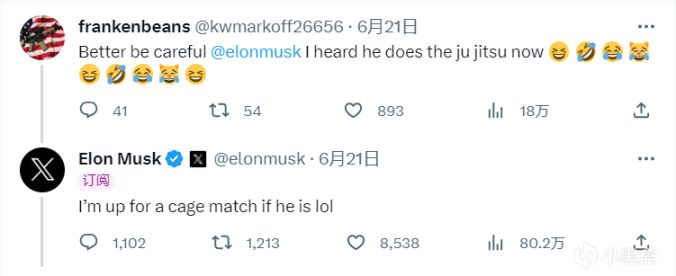 马斯克立马回应:“如果小扎也愿意的话,我们可以来一场笼斗,lol。”