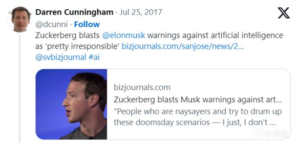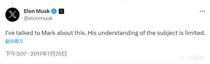 他在推特上说:”我和小扎谈过这件事,他在人工智能这件事上的理解是浅显的。“