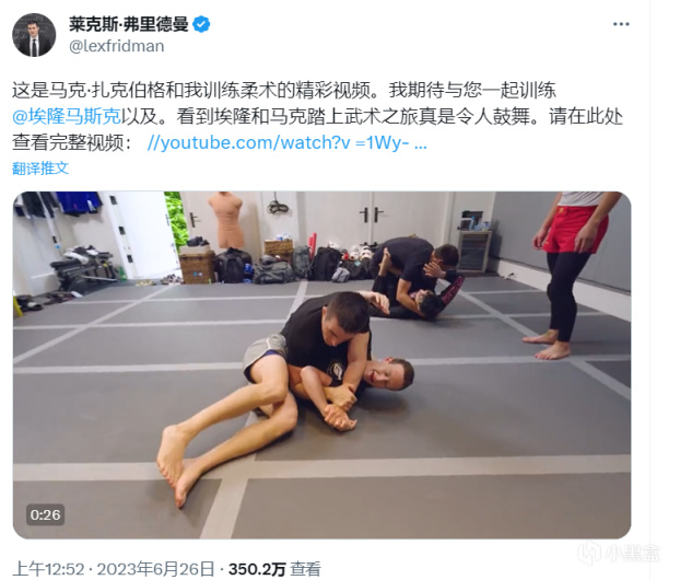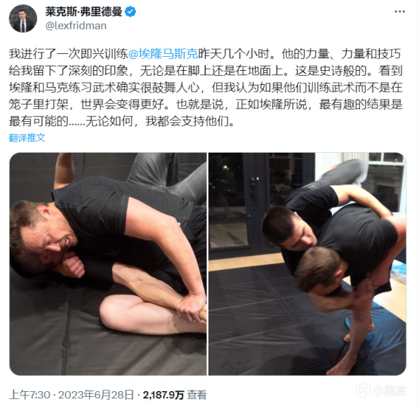 马斯克正在从一个名叫莱克斯·弗里德曼的教导下进行柔术训练,莱克斯是一个麻省理工学院工作的人工智能领域新秀,同时也是从2013年就开始参加巴西柔术比赛的武术家。