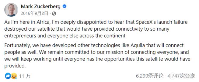 “当我身在非洲时,听到 SpaceX 的发射失败摧毁了我们的卫星,我深感失望,而我们的卫星本来可以为非洲大陆的众多企业家和其他所有人提供连接。”