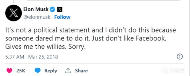 马斯克称:”我删除脸书账号不是为了发表声明或有人对我用了激将法,我这样做是因为我就是不喜欢脸书,这玩意儿让我毛骨悚然。“