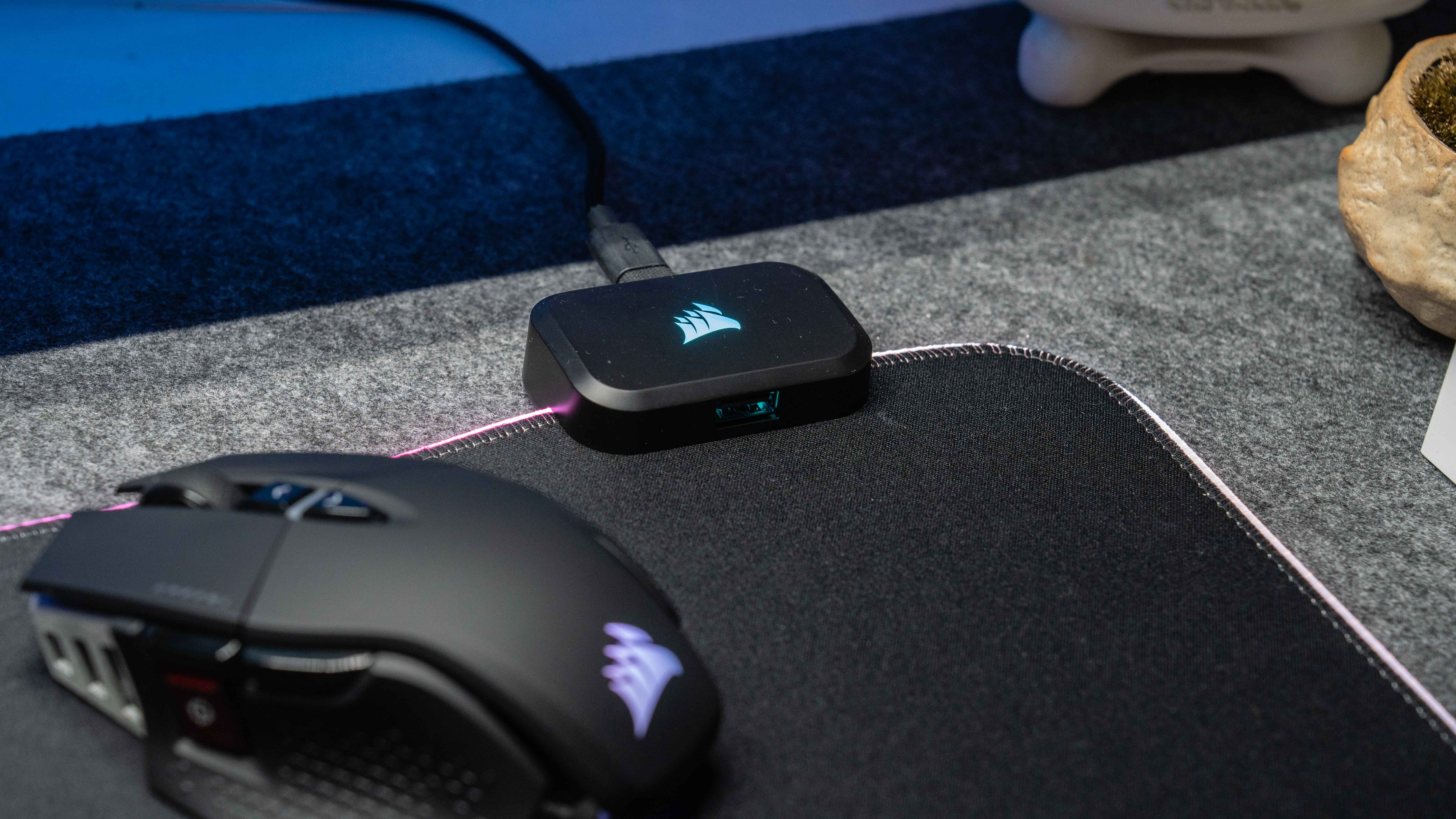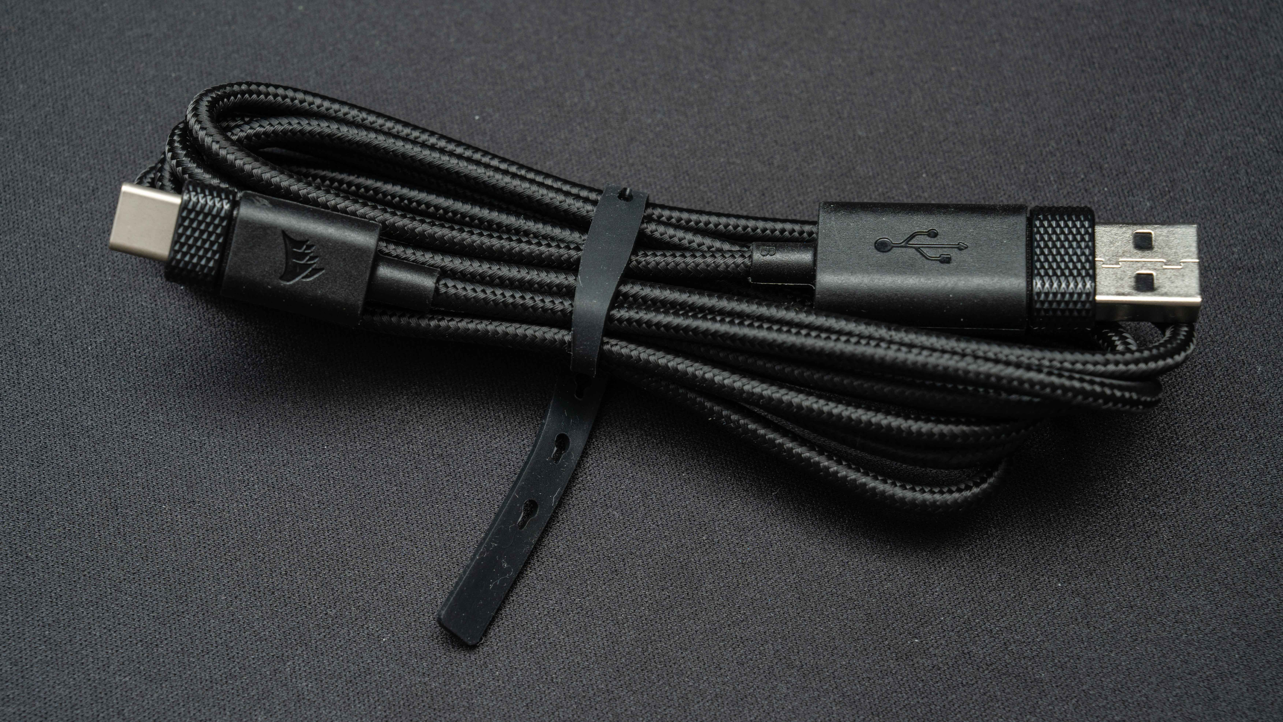 海盗船设备的配件设计真挺到位,键盘、鼠标和耳机都是编织线,鼠标的相对软一点粗一点,鼠标垫是橡胶线,线材材质或者USB头都有细微区别,可见都是单独设计的。
