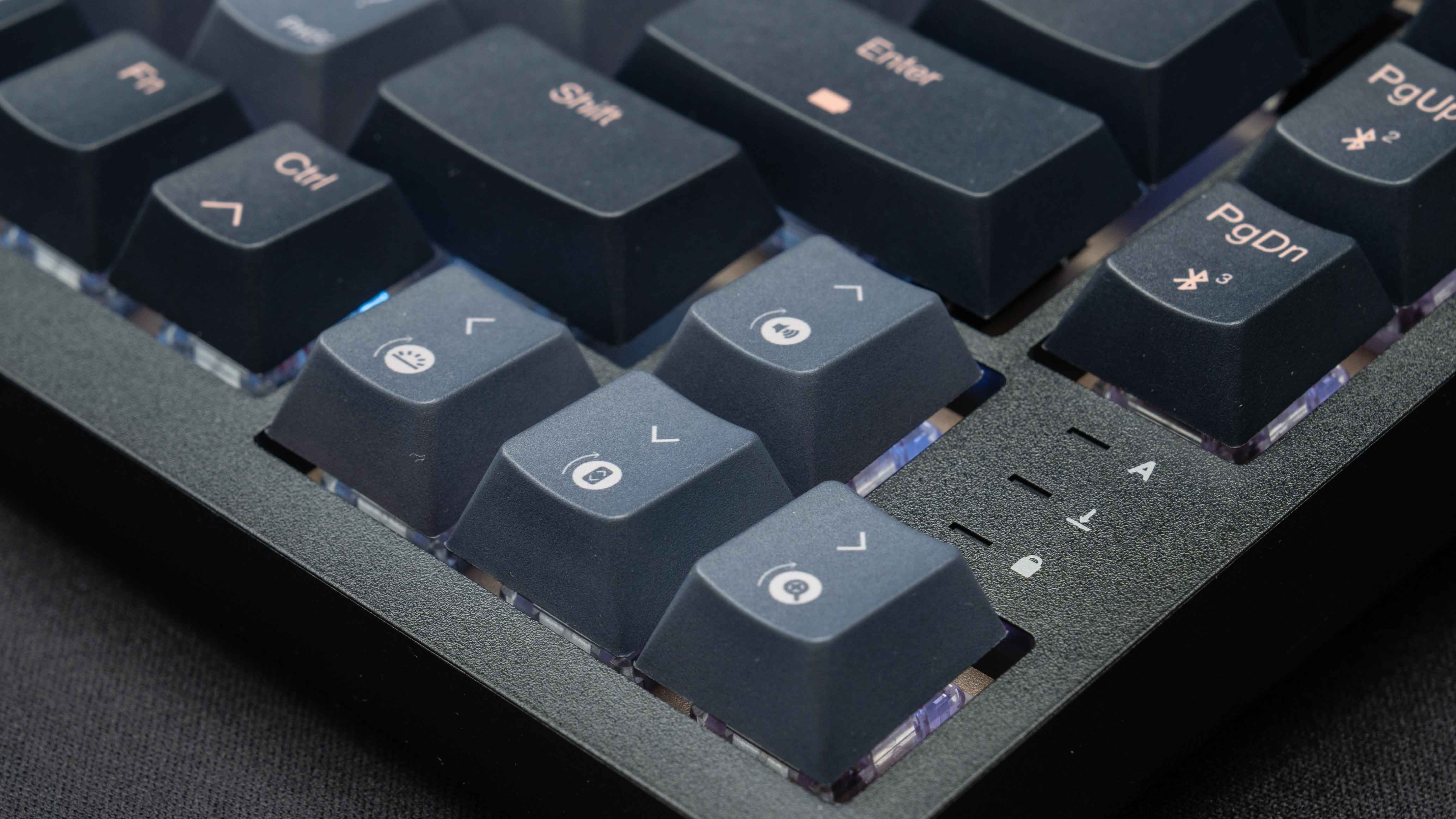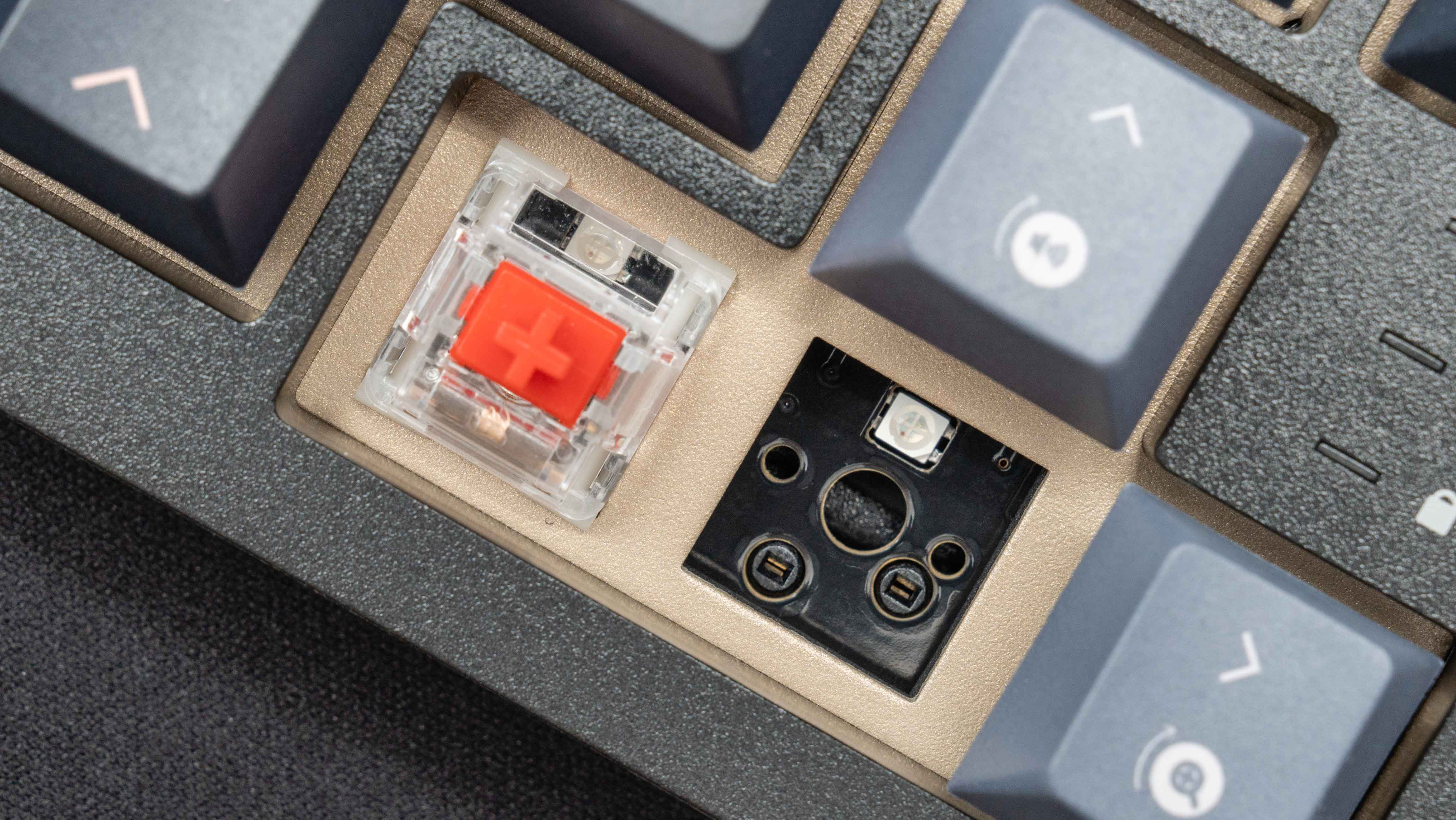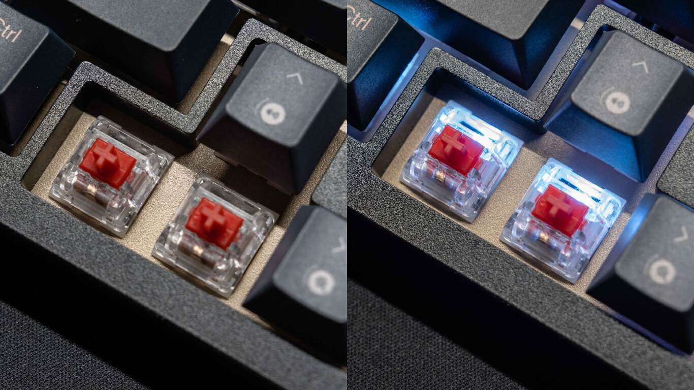 RGB灯珠在上边,轴体也空出了RGB光的位置,所以整体灯光比较通透,大品牌的品控确实是到位,拆轴和键帽的阻尼感非常到位,不容易掉,也不难拆,尤其是轴体,定位板的开孔很精确。