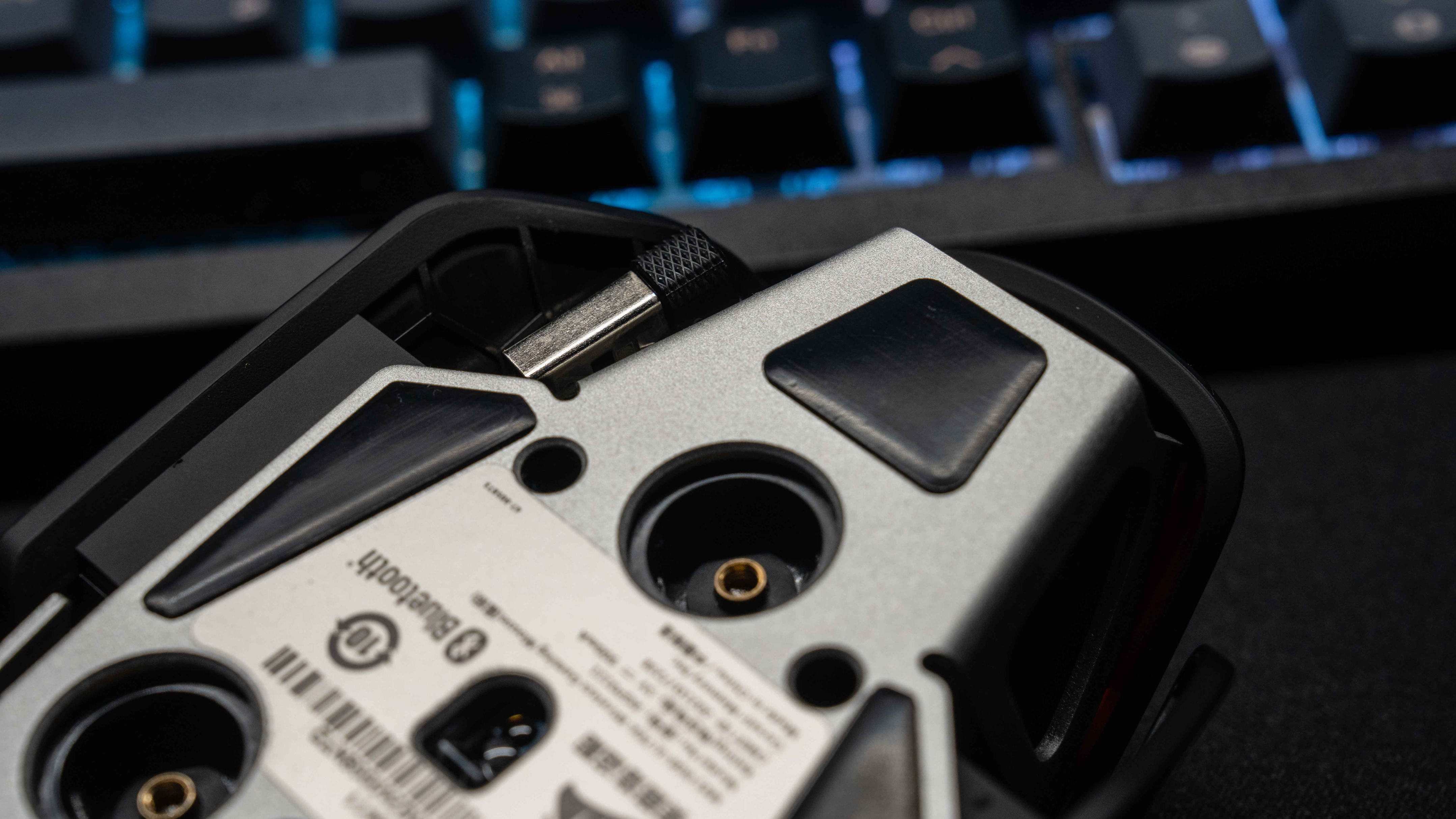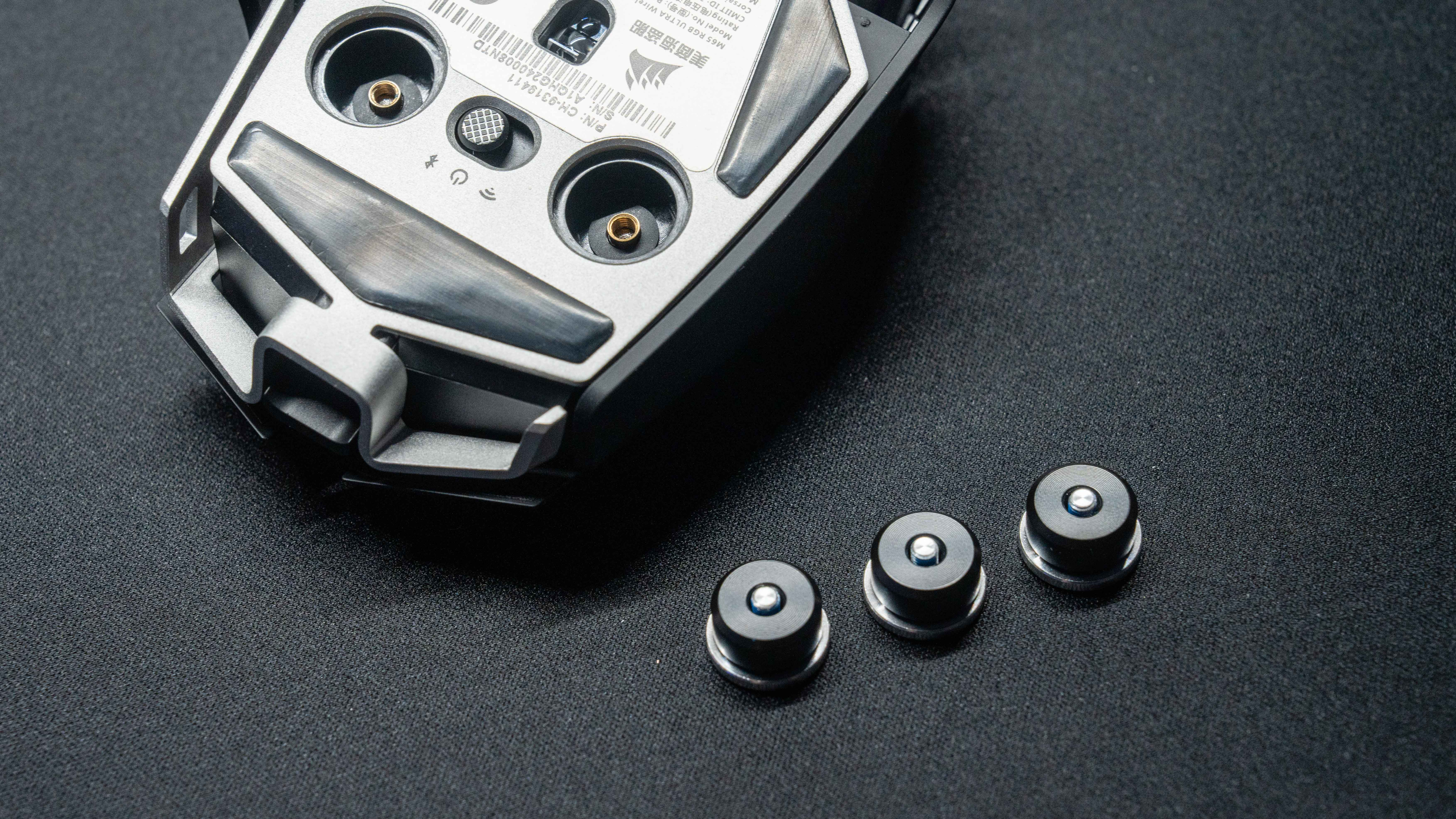 M65 RGB ULTRA的接收器也藏在底部,四片PIFE脚垫润滑度还不错,三块配重可以上在底部,我的建议是一块都不要用,因为M65的旗舰鼠标还配有六轴陀螺仪,不同方向地倾斜鼠标有手势操作,可以训练自己习惯手势操作,对于有些游戏,或者办公有奇效。