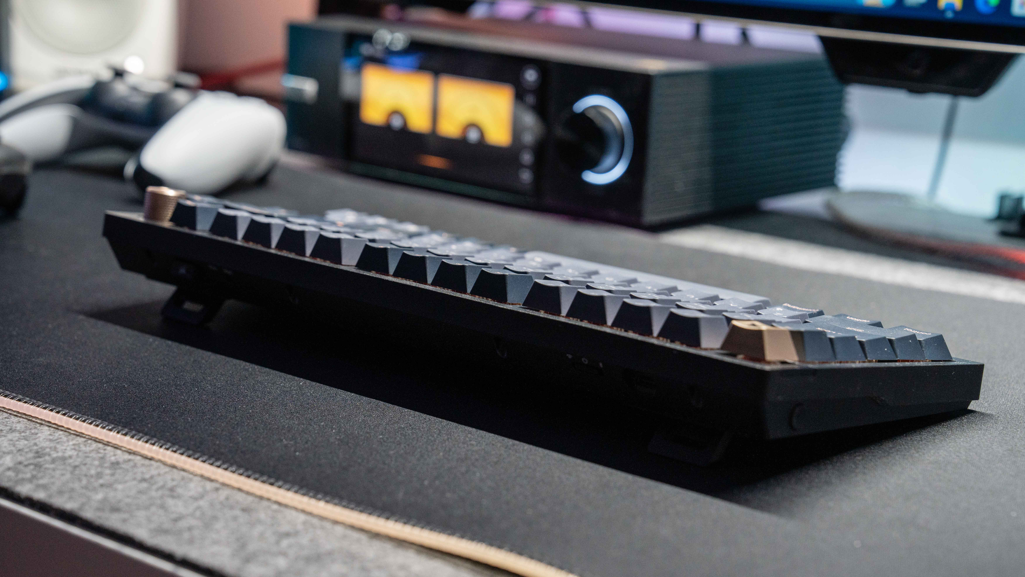 支脚抬高后,键盘的倾斜角度良好,毕竟不是旗舰级键盘,如果能配个像K100一样的手托使用就更舒服了。