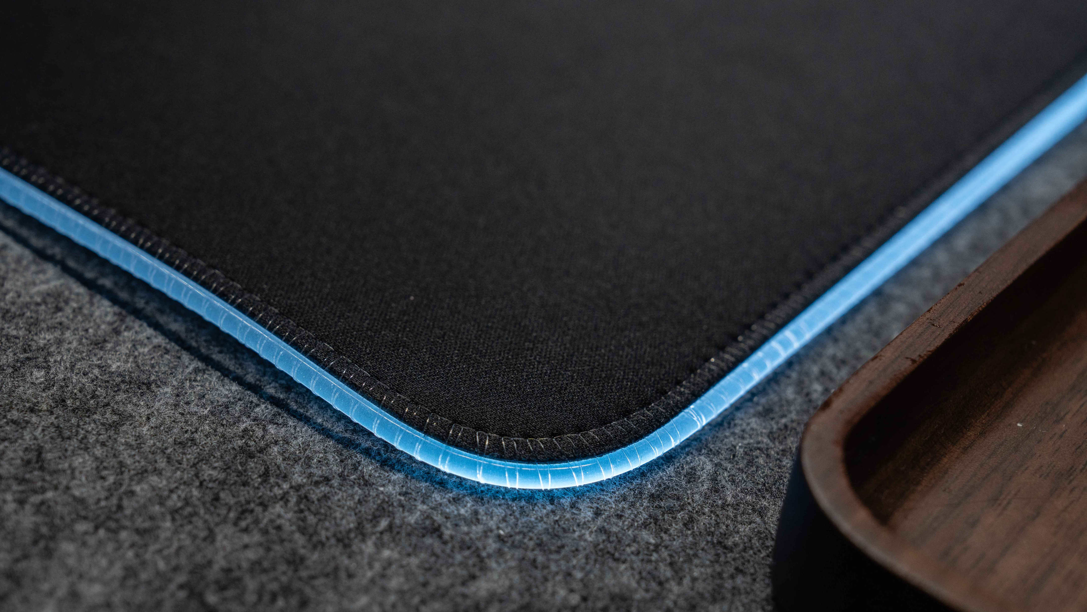 贼船MM700是光面垫,4mm的厚橡胶,胳膊放上去非常有质感,灯带的边角设计也非常精细,透明的线均匀地捆着灯带,不像某些品牌用黑线,虽然细但也难看。