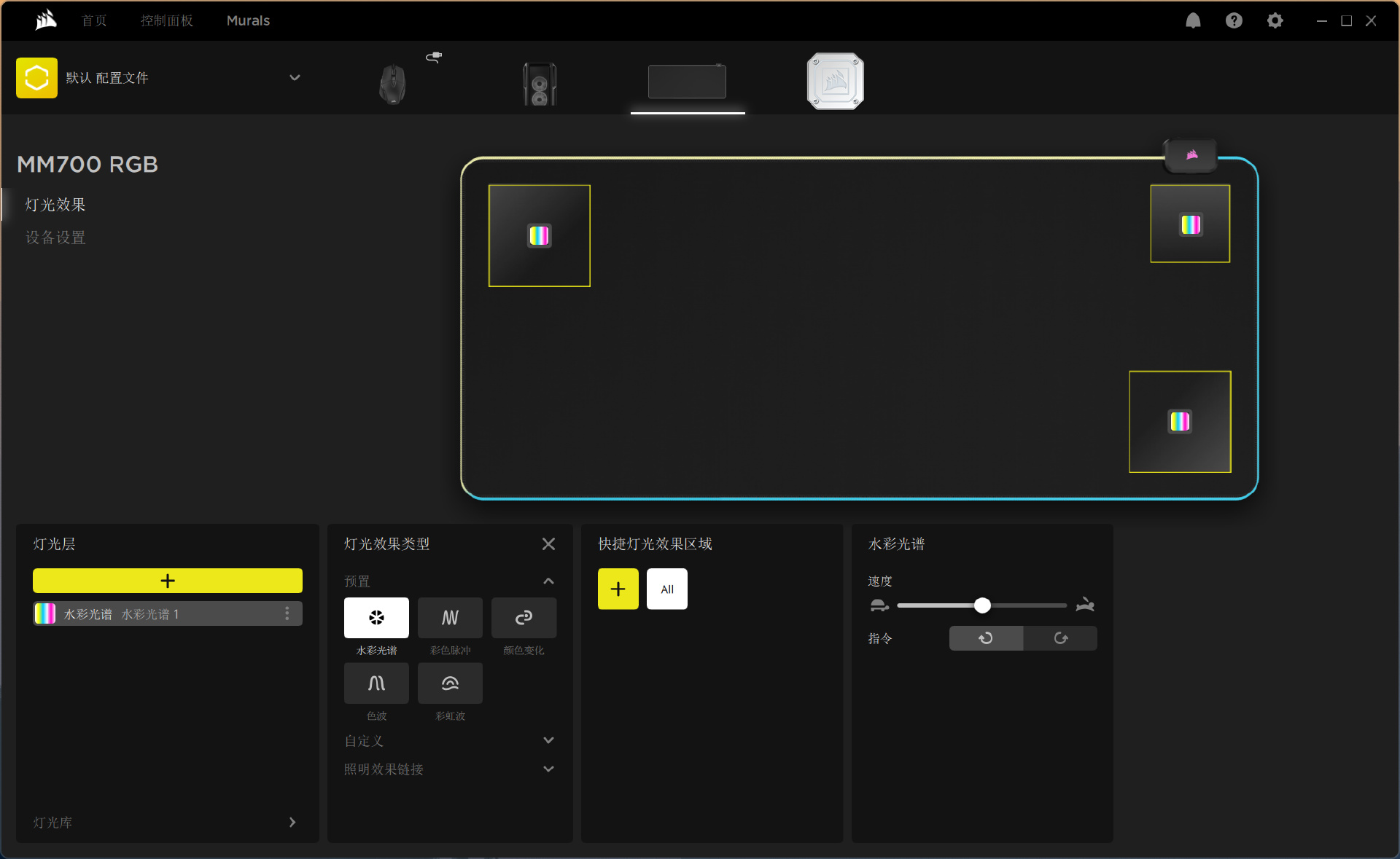 三个分区的灯效配置项,支持无iCUE板载设置。