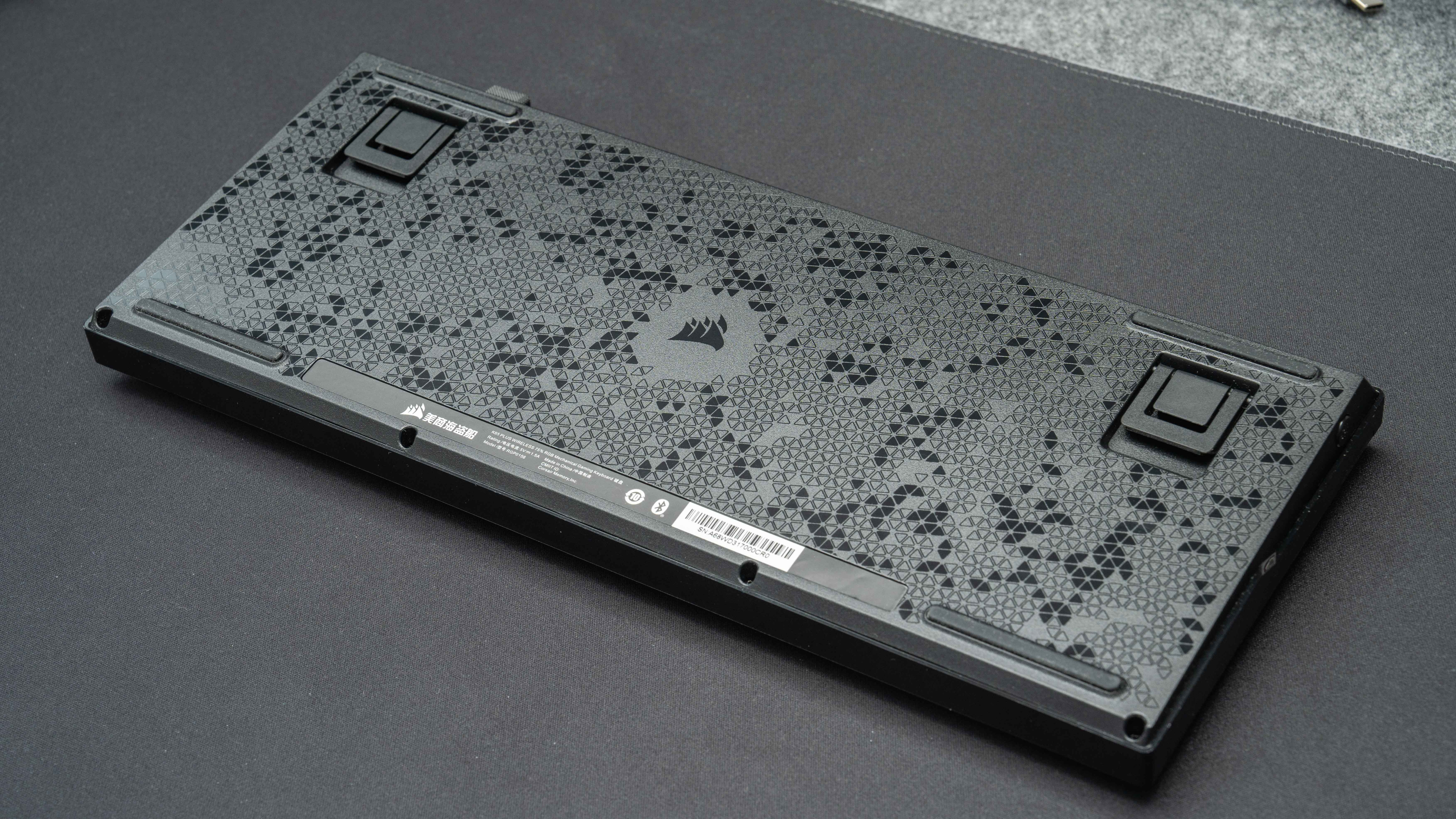 键盘背后是贼船标志性的三角图案和LOGO,两段式支脚和长条橡胶垫,保证了键盘的稳固。