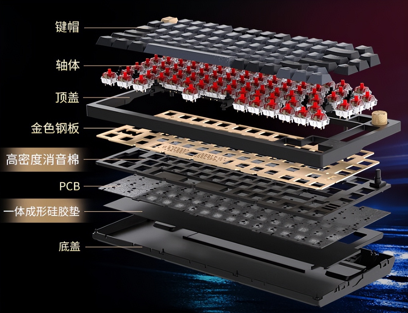 内部新增了复合式消音设计,使用缓震橡胶和减震棉提供消音及缓冲,再搭配全新轴体,手感虽然比Gasket还是有一点点差距,但比一众电竞键盘提升不是一点半点,贼船这款键盘也是用了心调校了,声音和手感达到很好的平衡。