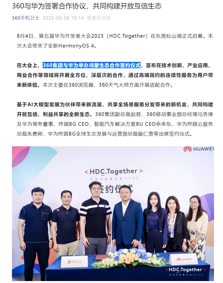 第五届华为开发者大会 2023 近日在东莞松山湖举行,360 集团与华为举办鸿蒙生态合作签约仪式,本次主要在 360 浏览器、360 天气大师方面开展适配合作。