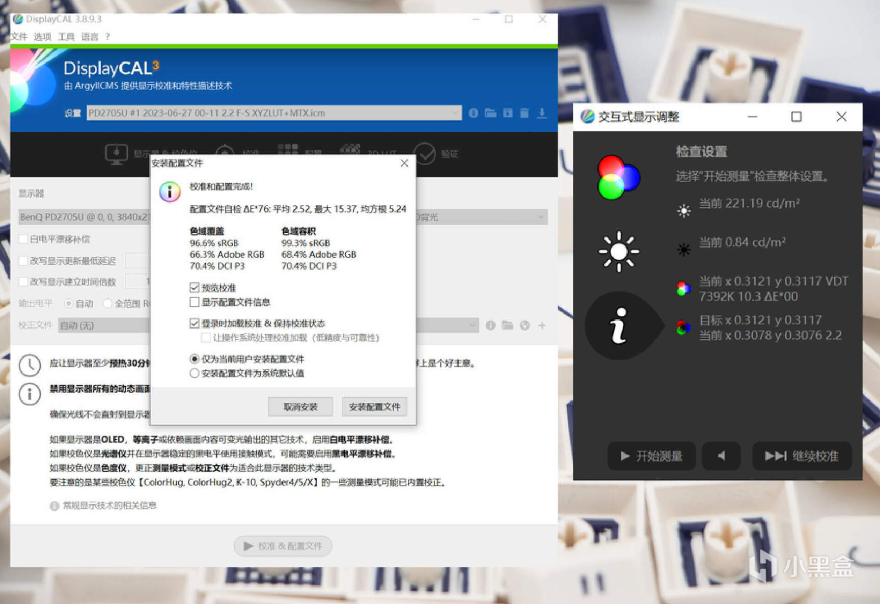 利用手中的德塔SpyderX校色仪配合DisplayCal软件查看明基PD2705U的面板表现,可以看到PD2705U在sRGB模式下色域缩限做的非常到位:sRGB色域容积控制在99.3%左右。96.6%的sRGB色域覆盖和2.52的ΔE*76值则说明了显示器色彩的精准。