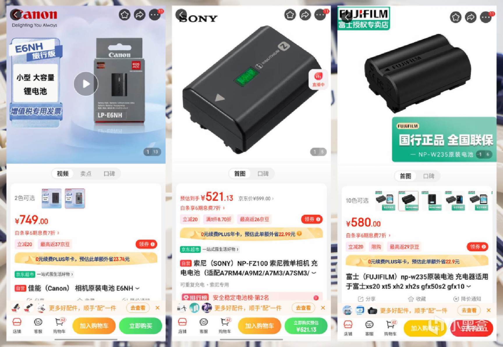 目前来看,各家相机厂商的原装相机电池价格非常昂贵,基本都是要500元以上的。预算有限的话,国产的副厂电池会是更合适的选择:都已经做到了机型全解码,支持正常的电量显示,也支持原厂充电器充电,甚至电池容量也比原装电池更胜一筹。