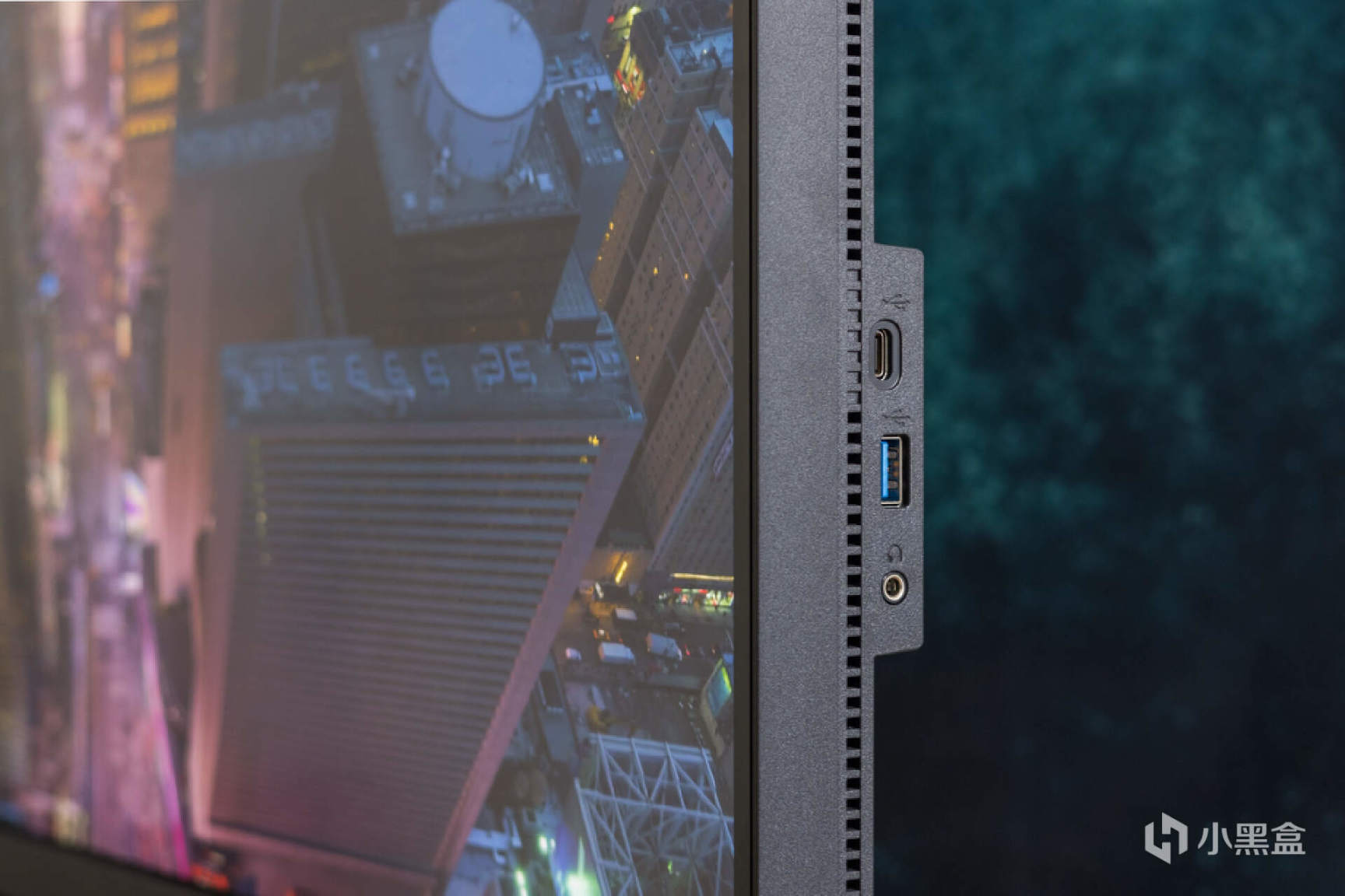 个人比较喜欢PD2705U的一个设计就是在显示器右侧边框上设计了用来接驳设备的接口区,从上到下提供了USB-C接口、USB3.2 Gen1接口、3.5mm音频接口。这样的设计对于日常插拔读卡器、存储设备非常的方便,特别是对机箱在桌下的用户非常的友好和人性化。