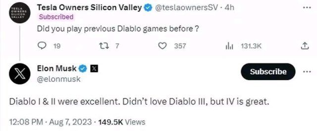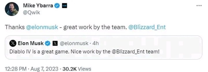 8月7日,马斯克又发推文称赞了《暗黑4》这款游戏。