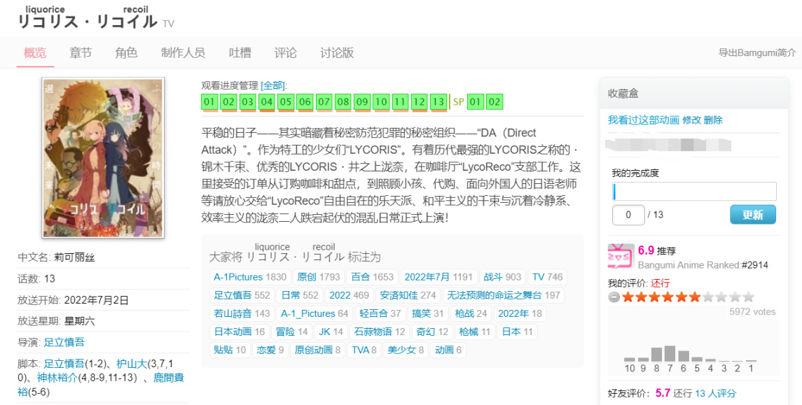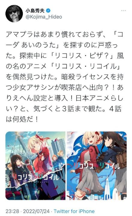 從簡介我們不難看出,作爲原畫師的足立慎吾業務水平在業內也是有目共睹的,再加之《莉可莉絲》工期充足,所以作畫自然是得到了保證的。但是和以往作品不同的是,《莉可莉絲》的主角錦木千束和井之上瀧奈這對沒頭腦不高興組合個性鮮明不內斂,敘事儘量不增添過多信息量而是做減法,很符合現代人的觀看習慣。加之這幾個充滿了“青春感“的片段在社交媒體上的病毒式傳播(有點像鬼滅),所以在網上就這樣火起來了,成爲1145141919810個人都看了連小島秀夫都在追再不看你就out了的網紅動畫。