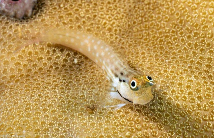 八重山异齿鳚有着半透明的淡灰色身体,身上有白色斑点,主体呈苍白色。胸鳍基部有着“V”形标记。