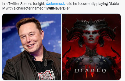 馬斯克曾表示過自己一直在玩《暗黑破壞神4》,使用的是一個ID爲“IWillNeverDie”的德魯伊。