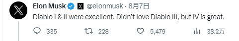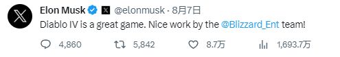 當天,馬斯克再發X,稱暗黑破壞神 IV 是一款很棒的遊戲。 Blizzard團隊幹得好!