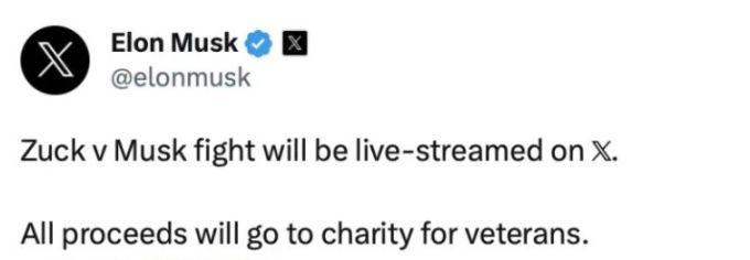 昨日,馬斯克宣佈與扎克伯格的比賽將在X上進行直播,並且將所有的收益都捐給退伍軍人慈善機構!