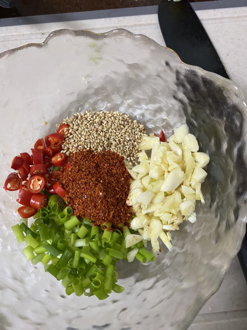 2.小葱,小米辣,蒜切末,再加入白芝麻和辣椒粉摆好,当然也可以不摆