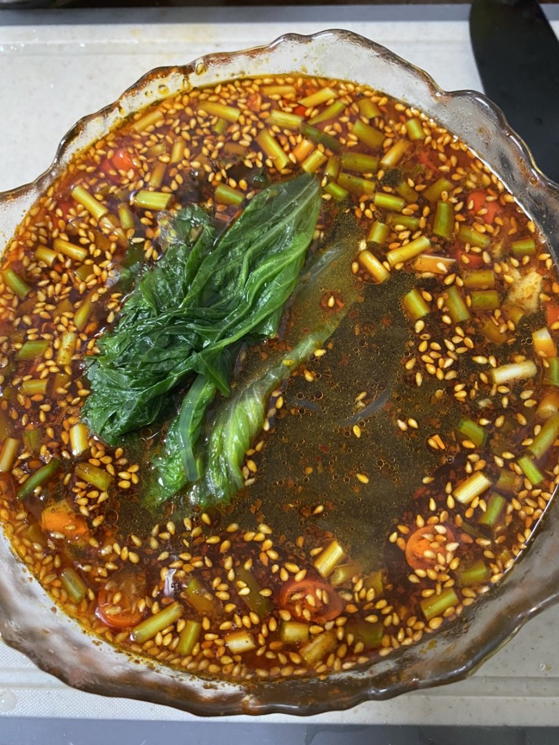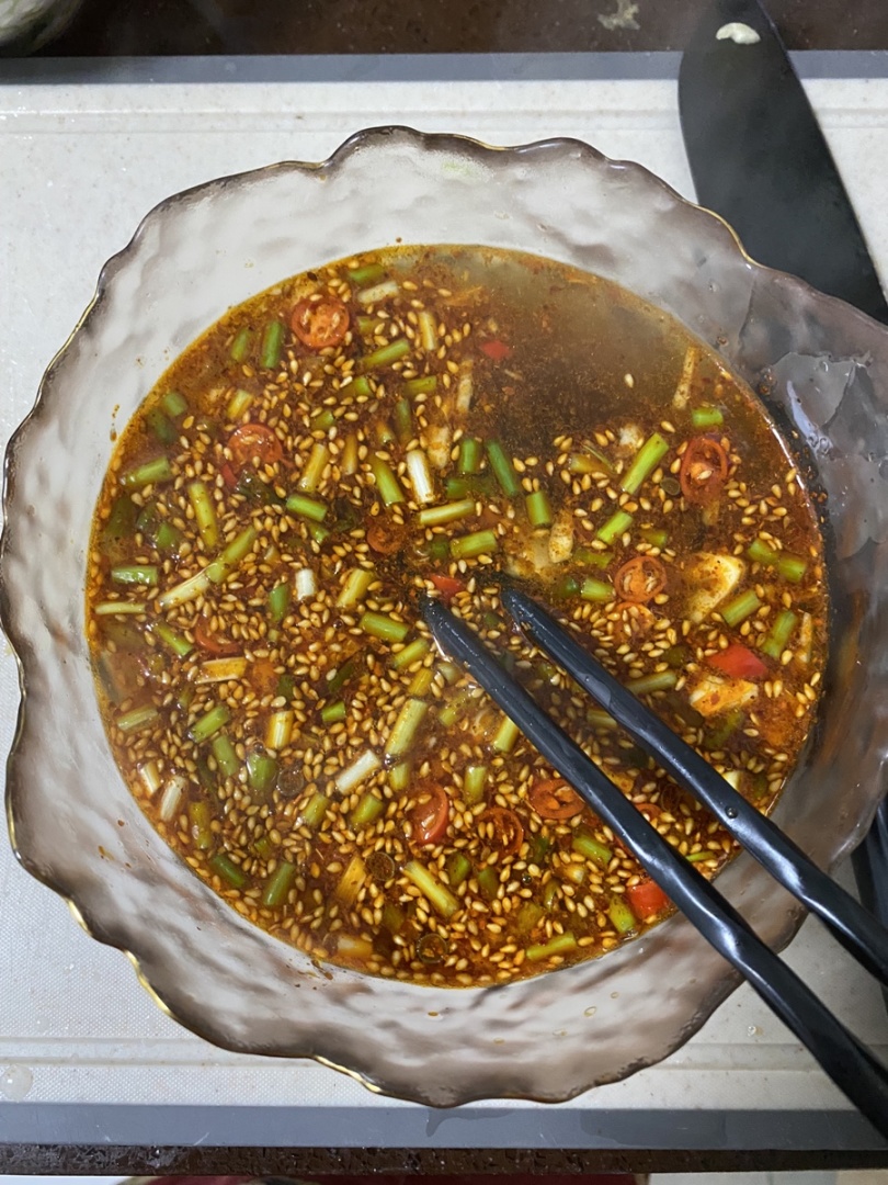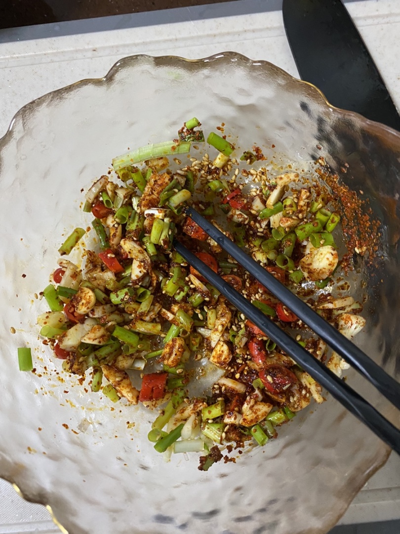3.用热油淋一下并搅拌均匀加入生抽,蚝油,醋,盐和鸡精(我喜欢麻所以加了点麻油)最后倒入少许开水