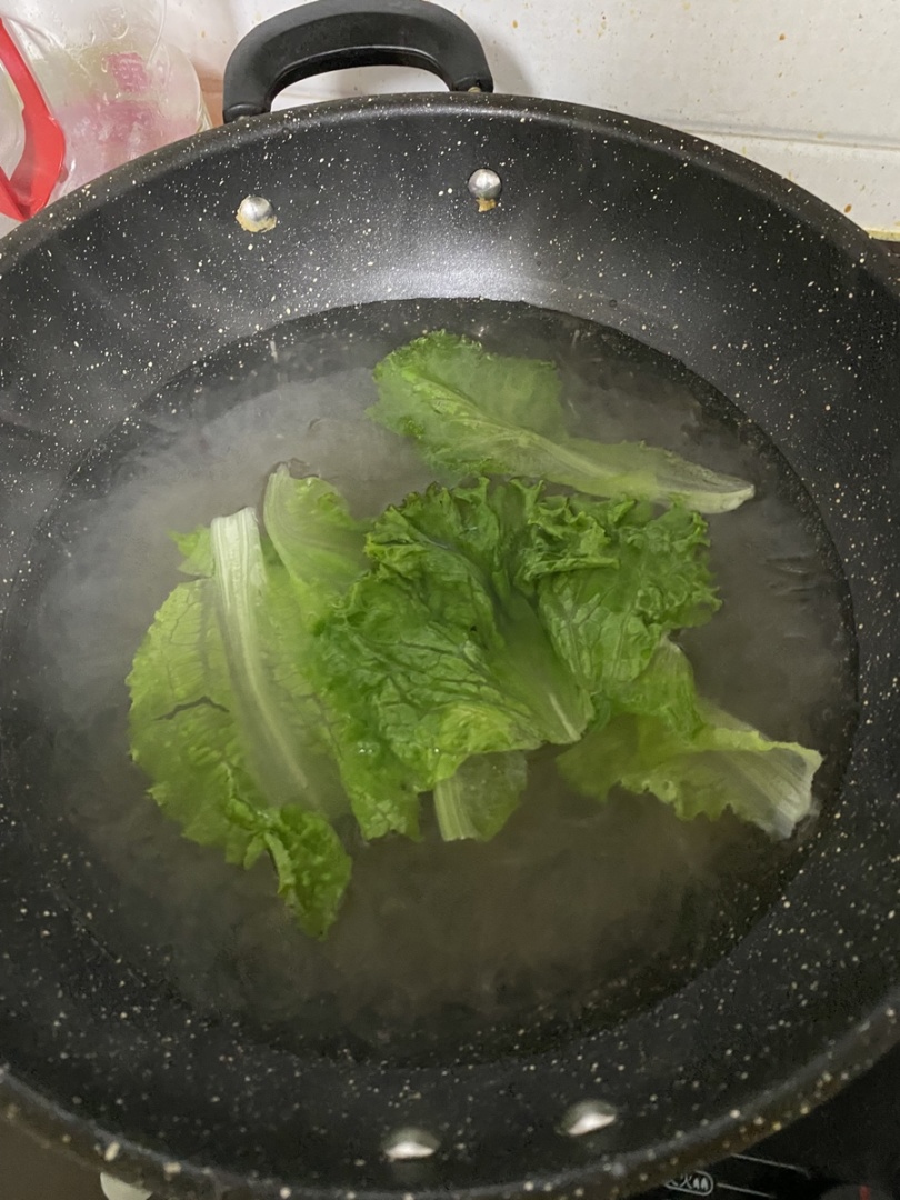 1.粉冷水下锅煮到透明状态下生菜烫一下