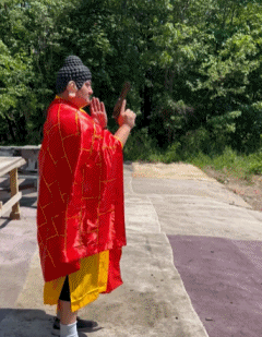 只見他穿上袈裟,立定站好,虔誠又優雅地一拜;