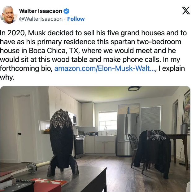 当地时间上周日,艾萨克森在X(前推特)上曝光了马斯克当前住所的内部情况。“2020年,马斯克决定卖掉他的五套豪宅,把位于得州博卡奇卡的一栋简朴的两居室房子作为他的主要住所。我们会在那里见面,他会坐在这张木桌旁打电话。”艾萨克森在推文中写道。