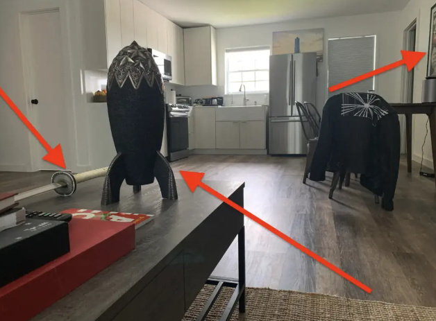 艾萨克森发布的照片展示了房子内的厨房和一部分客厅的陈设情况。他的咖啡桌上似乎有一把武士刀,一个有些像火箭形状的物体或雕塑,以及一些似乎是游戏的东西。