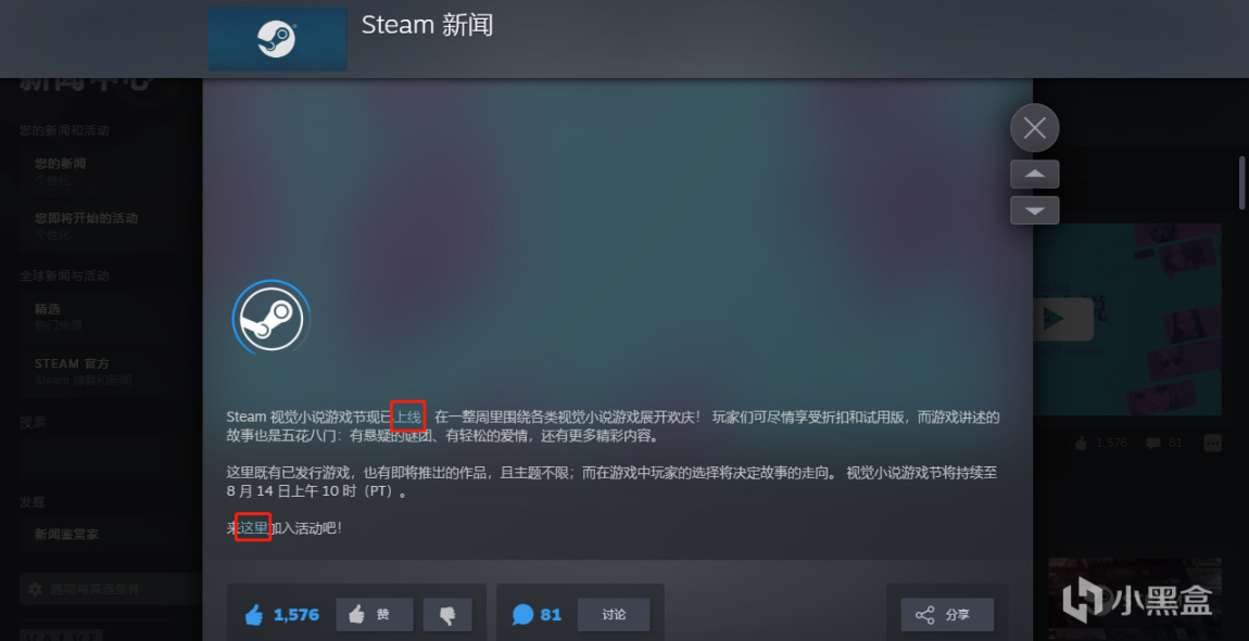 点开新闻里的视觉小说游戏节公告,下方这两处蓝色字体点击都可以直接跳转