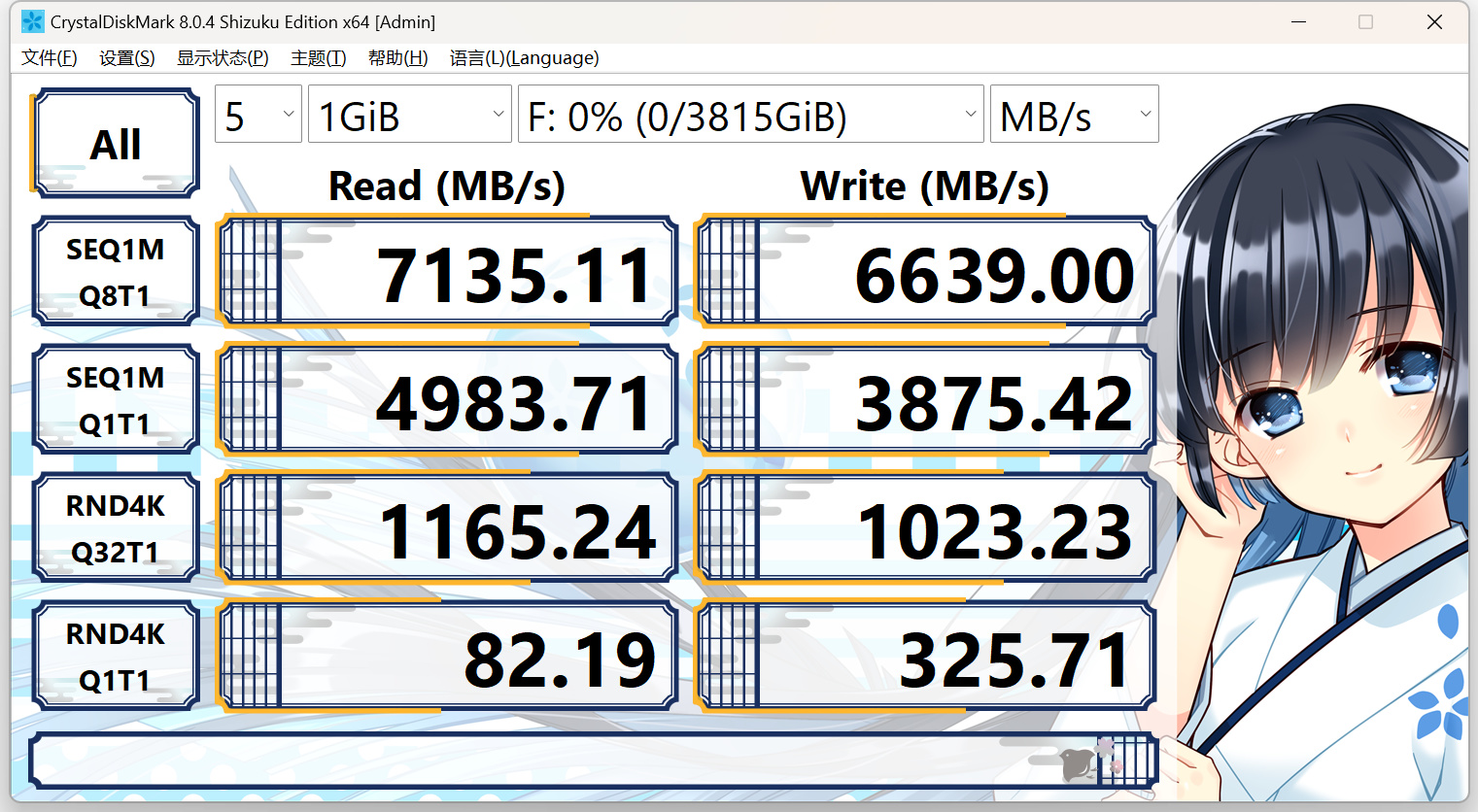 官方給出的理論讀取速度是7450MB/s,我使用CrystalDiskMark測試的順序讀取速度7135 MB/s,順序寫入速度6639 MB/s,大概是PCIe 3.0 SSD的2-3倍。4K隨機讀寫速度讓我有點小意外,超過了我之前測試過的所有SSD。