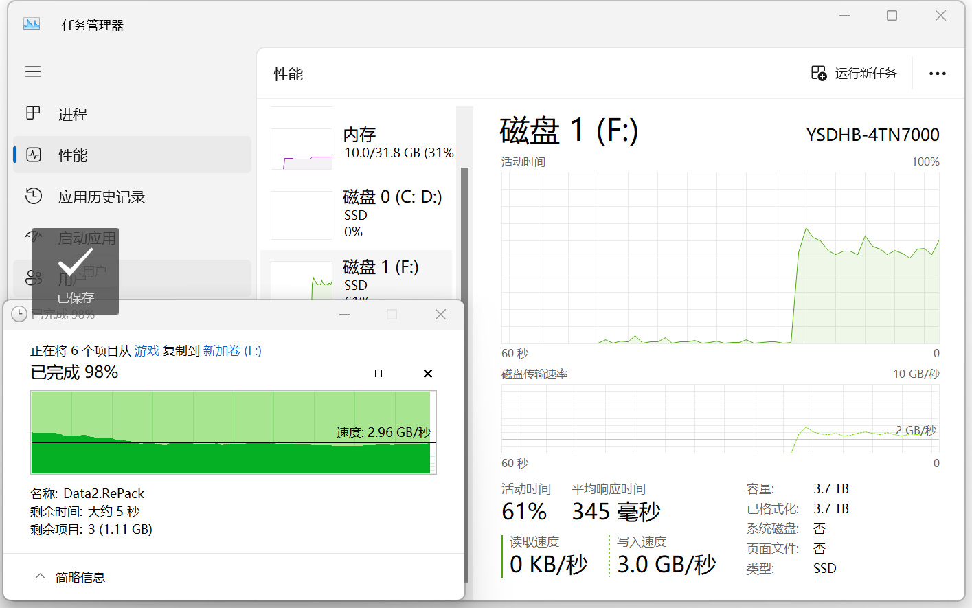 PCIe4.0固態硬盤最直觀優勢是軟件的啓動和加載速度、文件拷貝速度、剪輯渲染等場景都會有明顯提升。日常使用時,兩塊PCIe SSD之間的文件傳輸速度穩定在3.0GB/s上下。當然,這個速度受兩端設備的硬盤規格和接口影響。