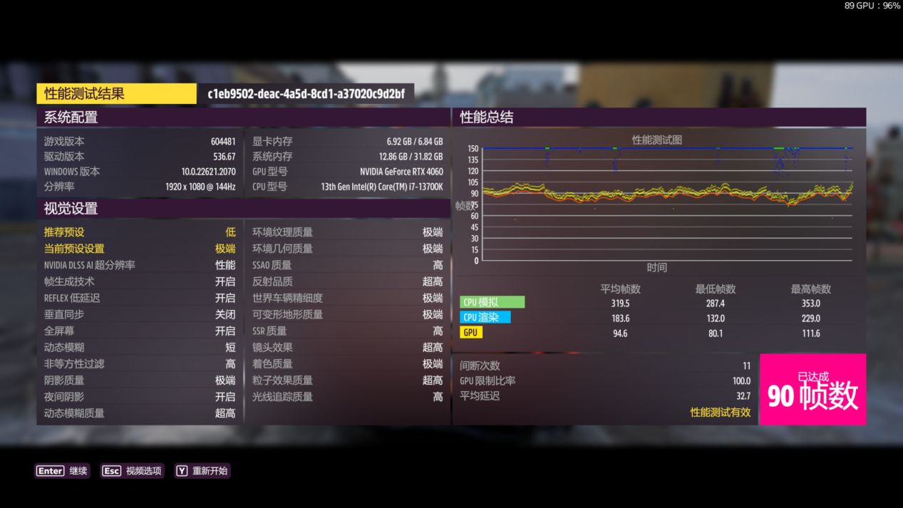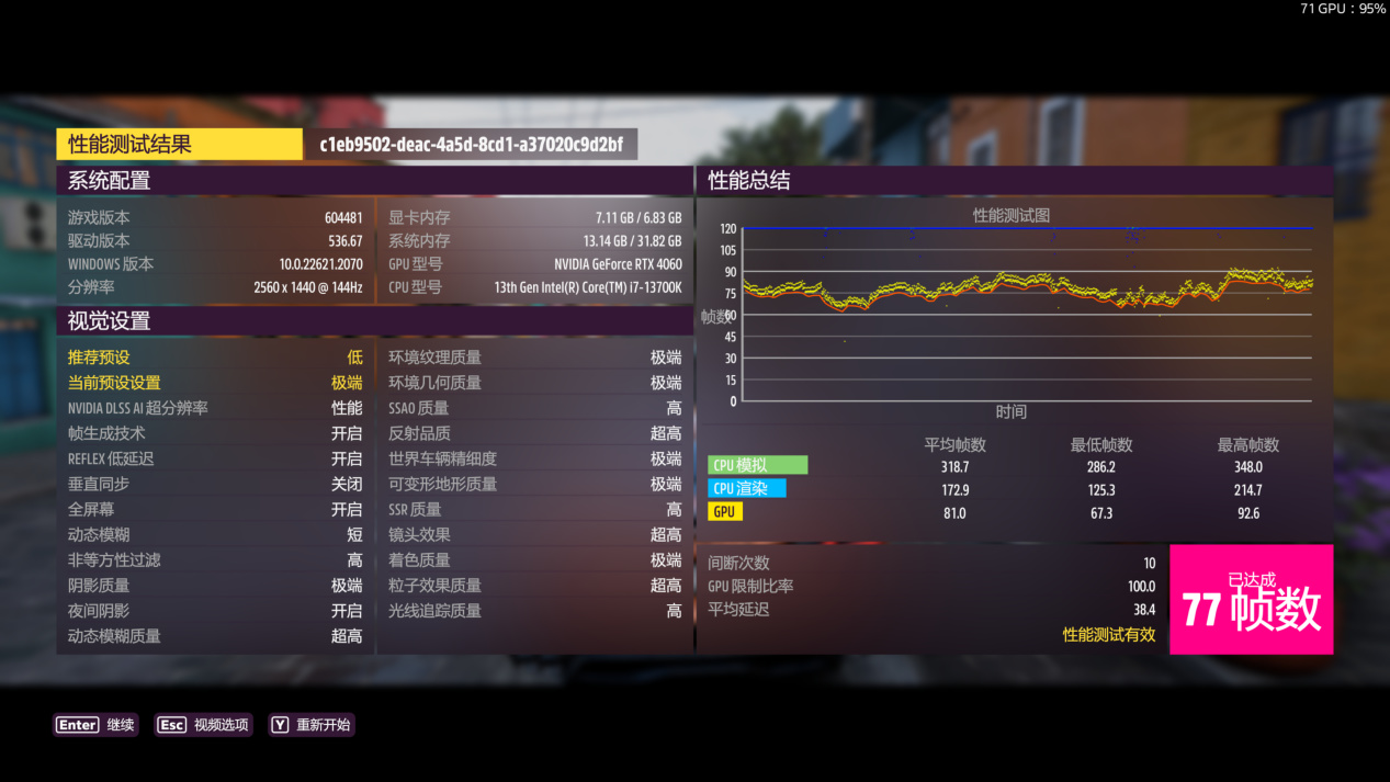 1080P预设最高画质平均90帧,2K预设最高画质平均77帧