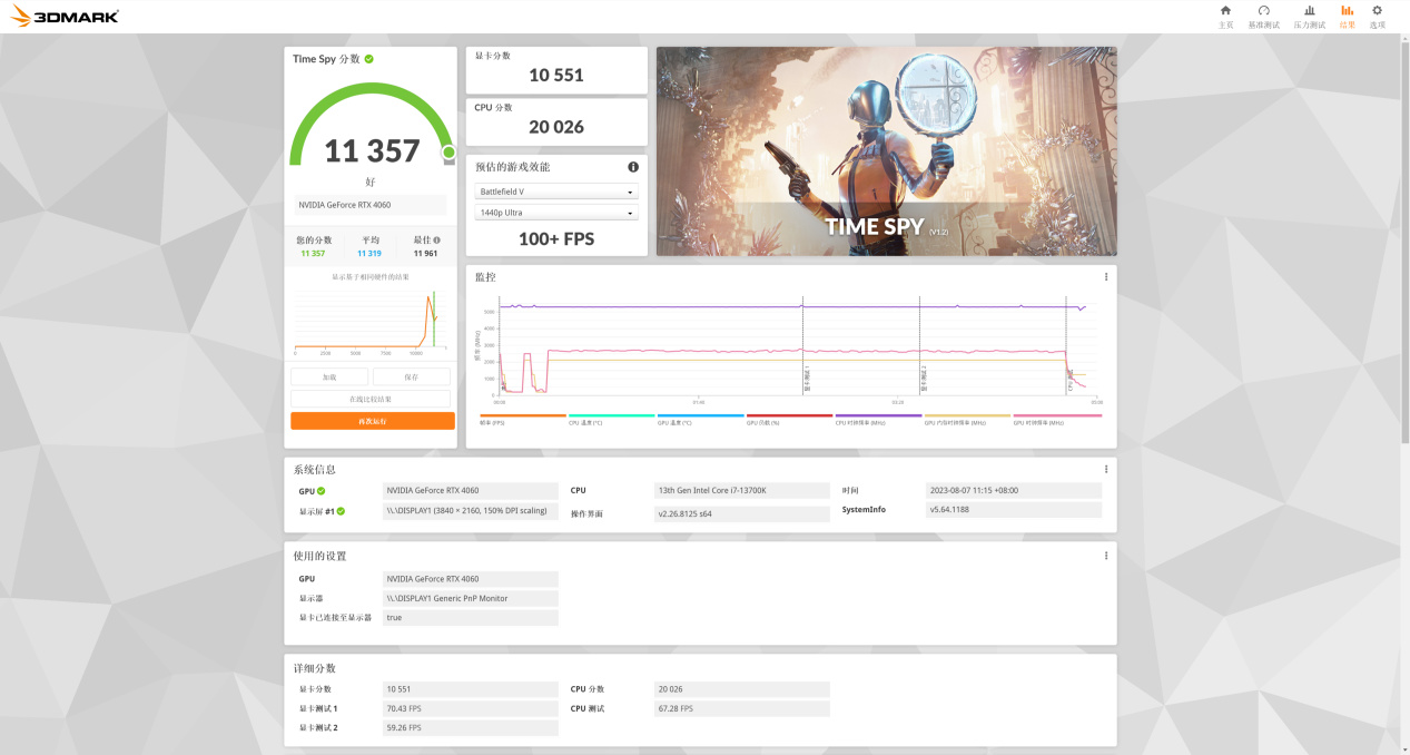 3DMark Time Spy跑分成绩10551,作为对比,3060 12GB跑分大概是8800左右,4060Ti跑分大概是13200左右,相较于3060 12GB强19%左右,相较于4060Ti弱20%左右。