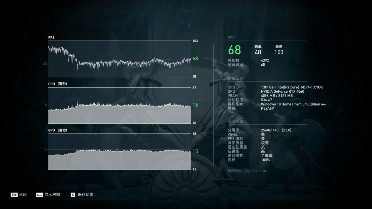1080P预设最高画质平均84帧,2K预设最高画质平均68帧