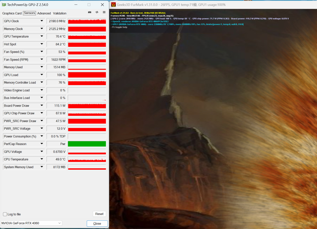 烤机环节,单烤甜甜圈30分钟,显卡温度70.4℃,这张卡的功耗只有115W,满载一直在115W左右,不需要考虑入手中高端型号,最丐的版本就足够了。
