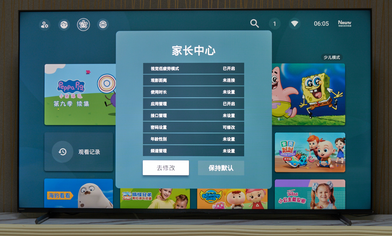 ▲說到老人與小孩可以玩轉,這裏再說一下索尼XR-65X90L的個性化賬戶功能,其擁有兒童模式、老人模式等針對性的桌面設置,比如這個兒童模式,進入後電視會自動開啓低藍光護眼模式,同時可以設置兒童的年齡以推薦對應年齡段的節目,同時家長還可以設置觀看時長,退出兒童模式時也需要輸入家長的預設密碼,有效避免兒童接觸到少兒不宜的節目。