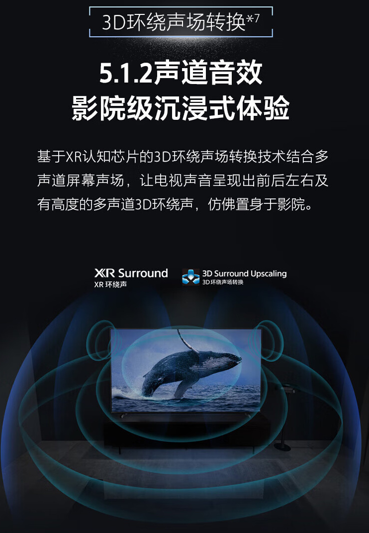 ▲索尼XR認識芯片可以將網絡與有線電視上常用的雙聲道音頻轉換爲5.1.2聲道效果的3D環繞聲場,有效利用 XR-65X90L所擁有的諸多揚聲器,爲觀衆提供3D環繞聲場。