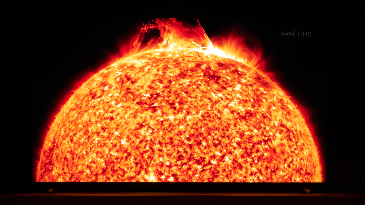 ▲再來看一下太陽表面的畫面,畫面的特點是亮出與暗處交織混雜,十分考驗電視的畫面解析能力,如果解析能力不夠強,畫面很容易糊成一片。SONY XR-65X90L的表現還是很讓人滿意的,太陽表面的紅色太陽風十分清晰可辨認,暗處深邃,亮處耀眼,把太陽那種內含巨大能量,隨時可能爆發出來的狀態很好的呈現了出來,XR認知芯片的XR清晰影像功能可以說很好的通過了考驗。