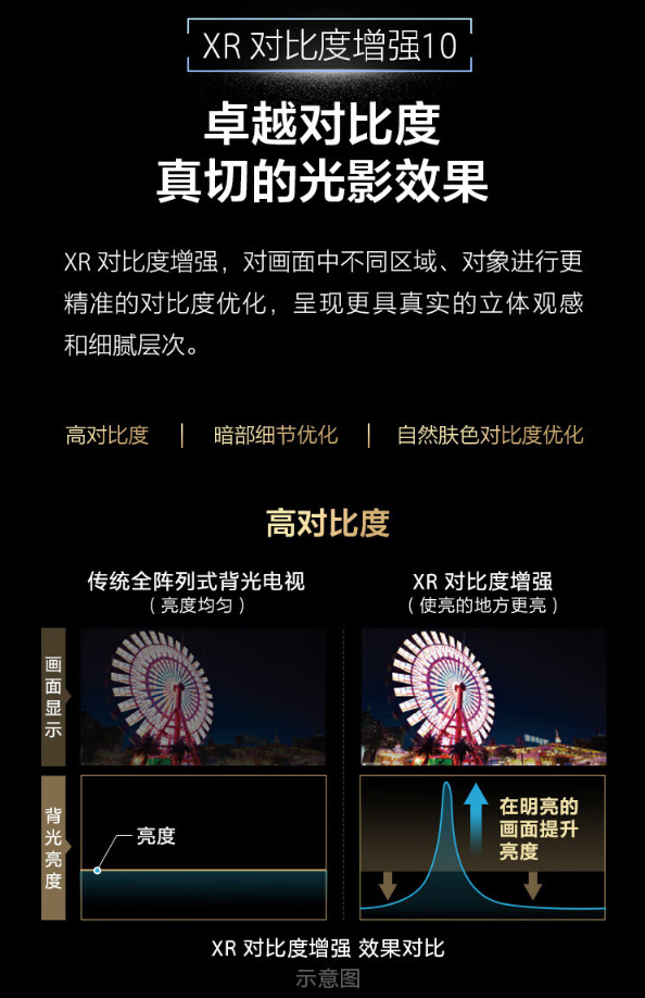 ▲XR 對比度增強10可以針對性的調整屏幕背光亮度,使畫面亮處更亮,暗處更暗,進而大幅增強畫面對比度,提升畫面的衝擊力。