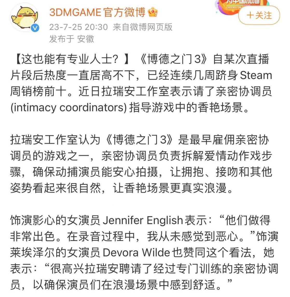 而且這次《博德之門3》背後的拉瑞安工作室(Larian Studios)還破天荒的爲遊戲準備了“親密協調員”這樣的聽起來高大上的職業親臨現場指導動捕演員去擺動作,幫助演員緩解尷尬氣氛,拆解動作。
