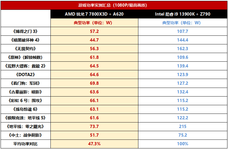 綜合主流遊戲的功率對比情況來看,銳龍7 7800X3D的平均遊戲功率僅爲酷睿i9 13900K的47.3%,可見其在能效比方面確實大幅領先了對手。