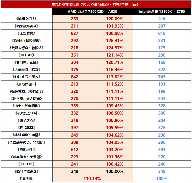 除了《博得之門3》之外,我們也對比了銳龍7 7800X3D和酷睿i9 13900K在其它主流遊戲中的性能,並進行了成績彙總。