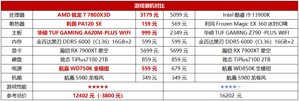 從表中的遊戲裝機配置對比可以看到,銳龍7 7800X3D搭配A620和百元級風冷即可放心使用,而酷睿i9 13900K要保證不過熱降頻和穩定運行怎麼也得配上360水冷和豪華版Z790主板,而顯卡也是旗艦級,所以電源也不能低於850W,如此一來裝機成本就會大幅上升。所以在總價部分,銳龍7 7800X3D這套主機不但性能更好,而且相對酷睿i9 13900K平臺擁有了高達3800元的價格優勢,性價比方面做到了完勝。