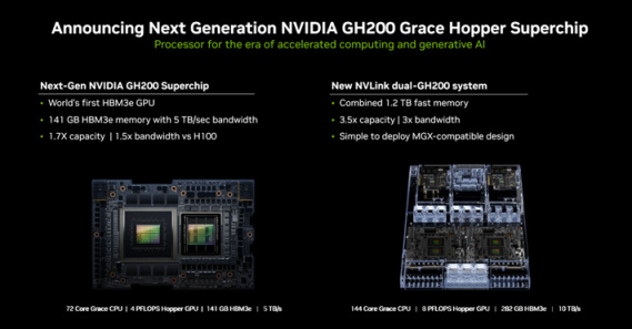 全新的GH200内存容量将增加至原有的3.5倍,带宽增加至3倍,包含一台具有 144 个 Arm Neoverse 核心的服务器,提供 8 petaflops 的 AI 算力!
