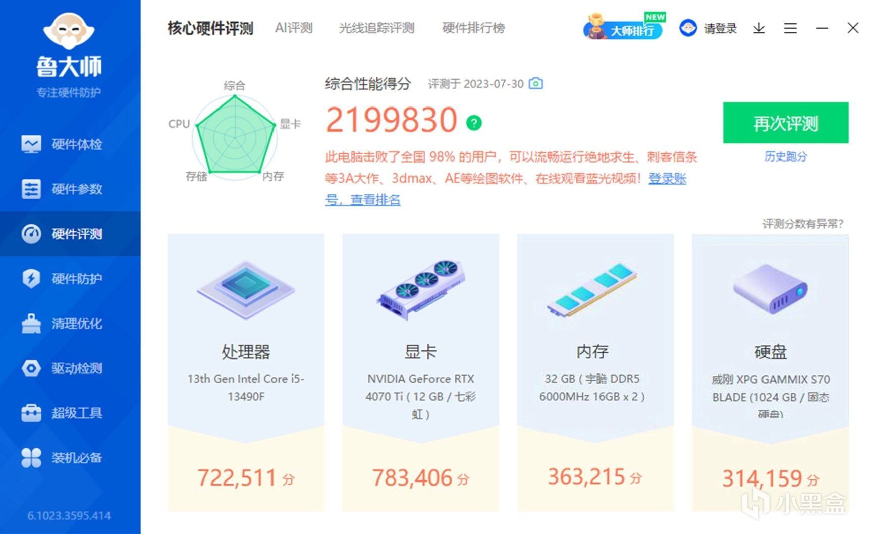 既然都花费了1万多的预算来折腾,肯定不能单靠外观来支撑整个主机吧?那么性能方面也是针对2K分辨率来进行的。首先来看下鲁大师的综合性能得分:2199830。