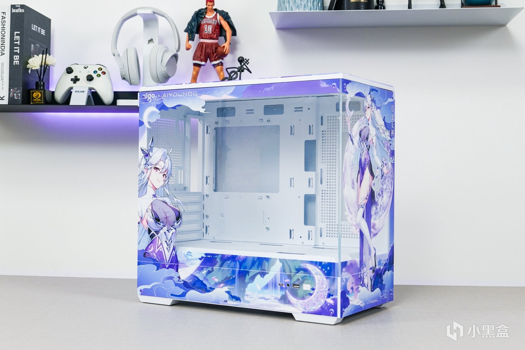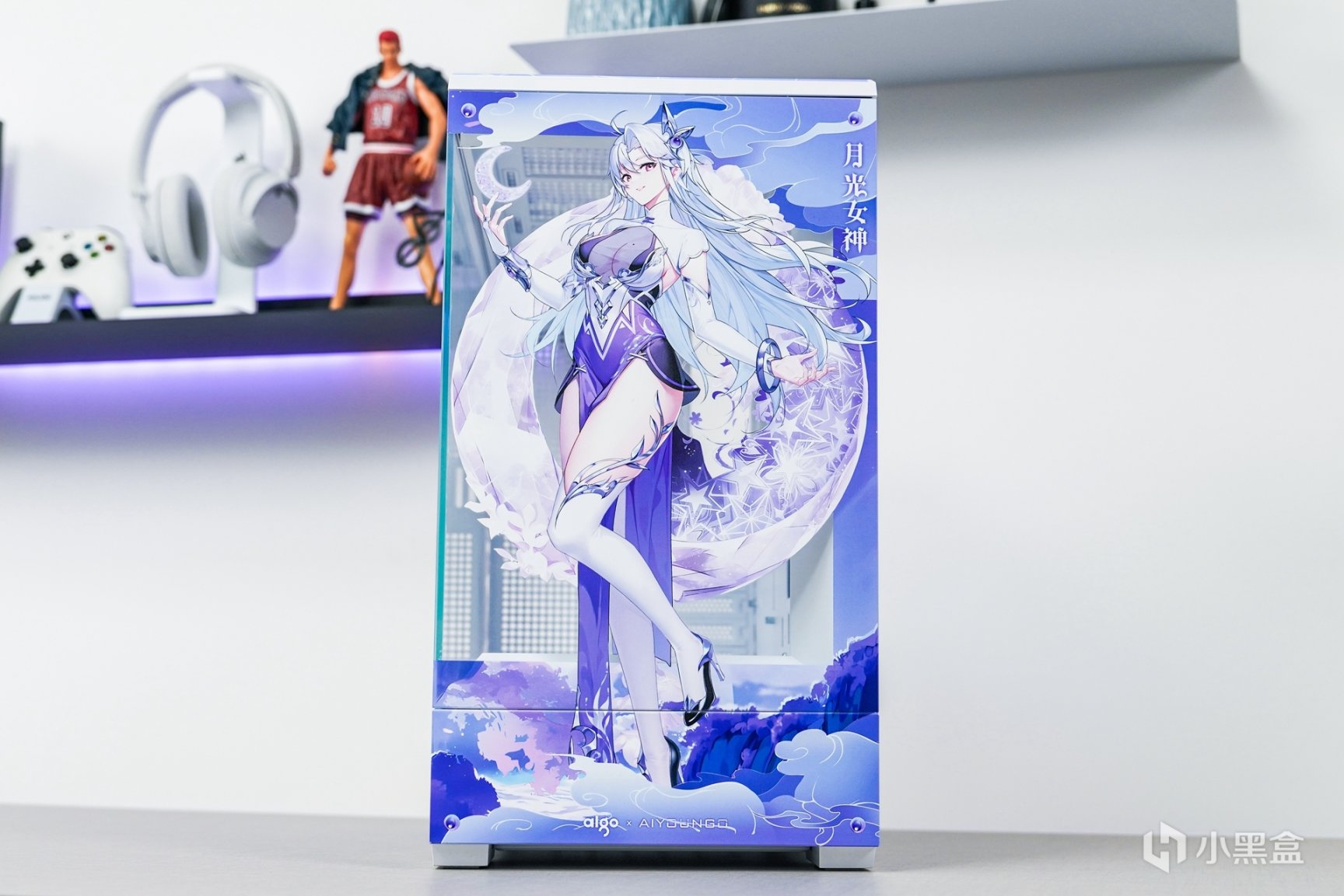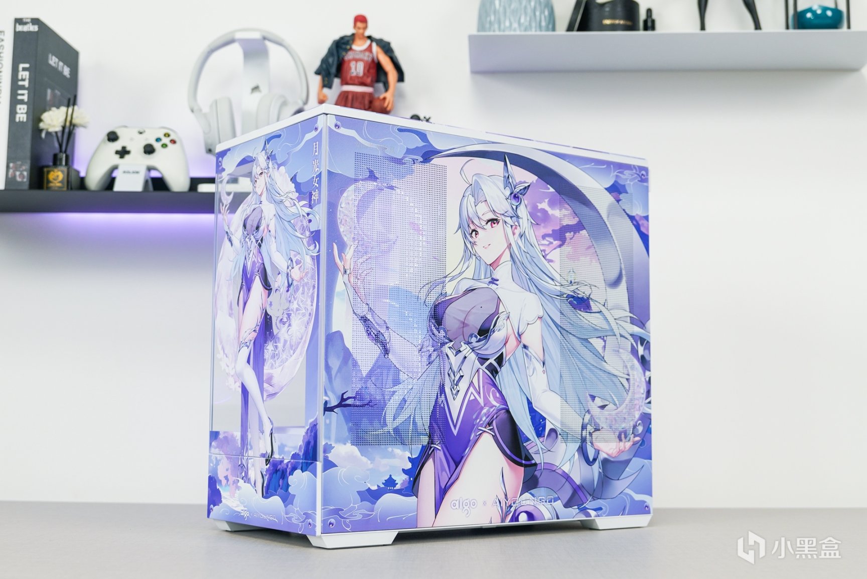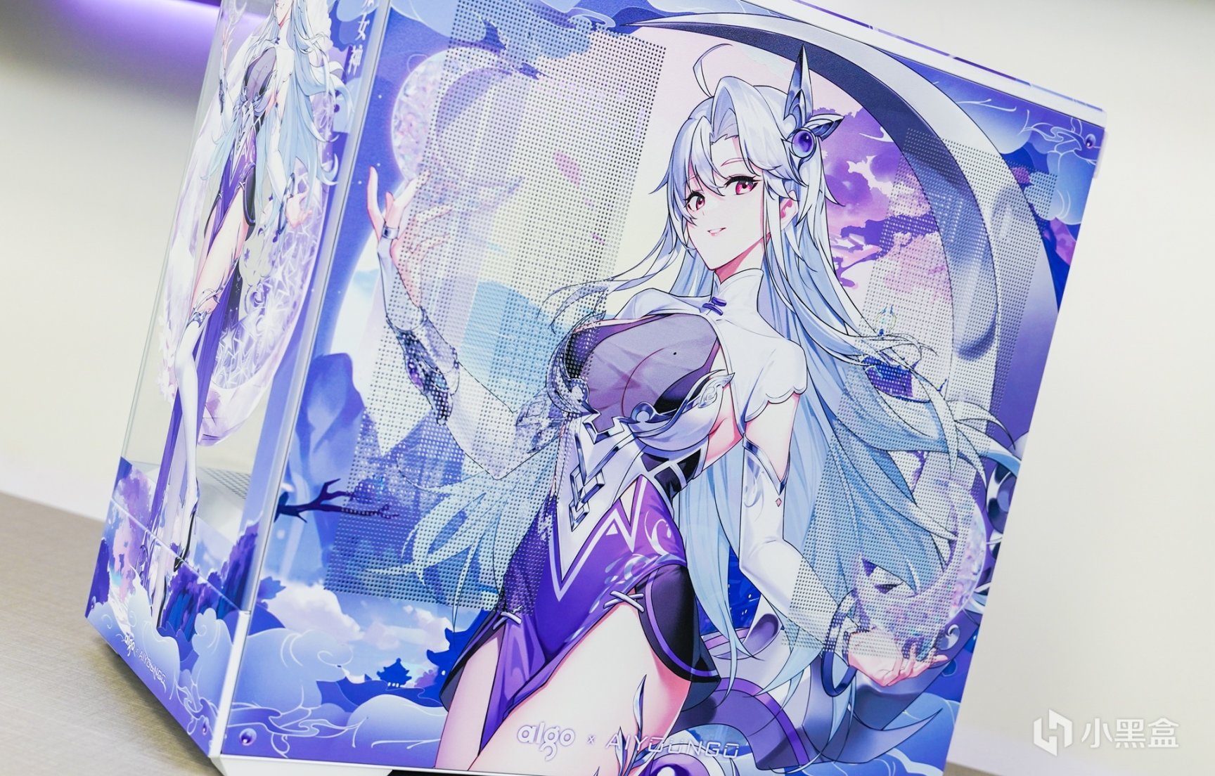 随着次元文化的不断发展与普及,次元文化已经在年轻一代中非常的普及,随着越来越多的本土化次元文化的兴起,原创的国风IP融入主机外观上,不但让主机外观更有辨识度,还可以更好的展现和表达更具个性化的主题。这次以国风IP—月光女神为主题(AIGO为了星璨岚所推出的虚拟次元人物)的主机安装完成后,浅蓝、浅紫和白三组色调的图案主要是为了突显整个主机的主题。