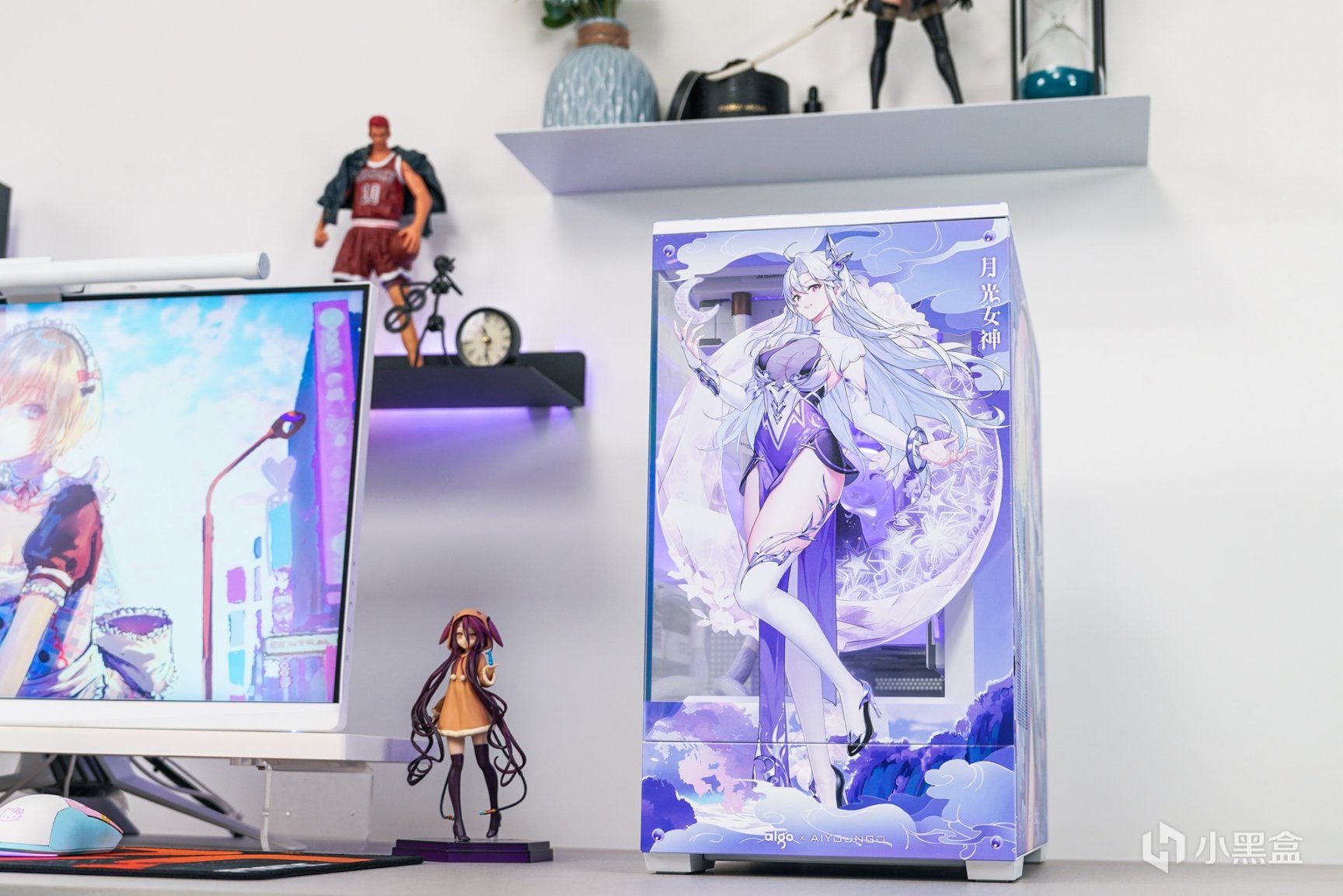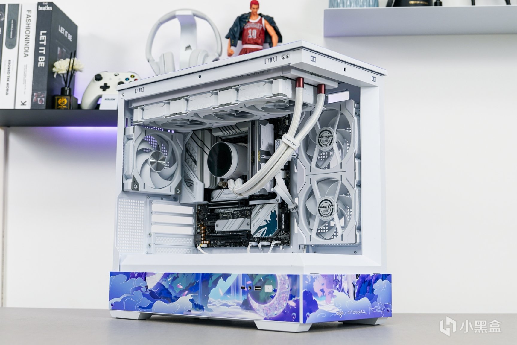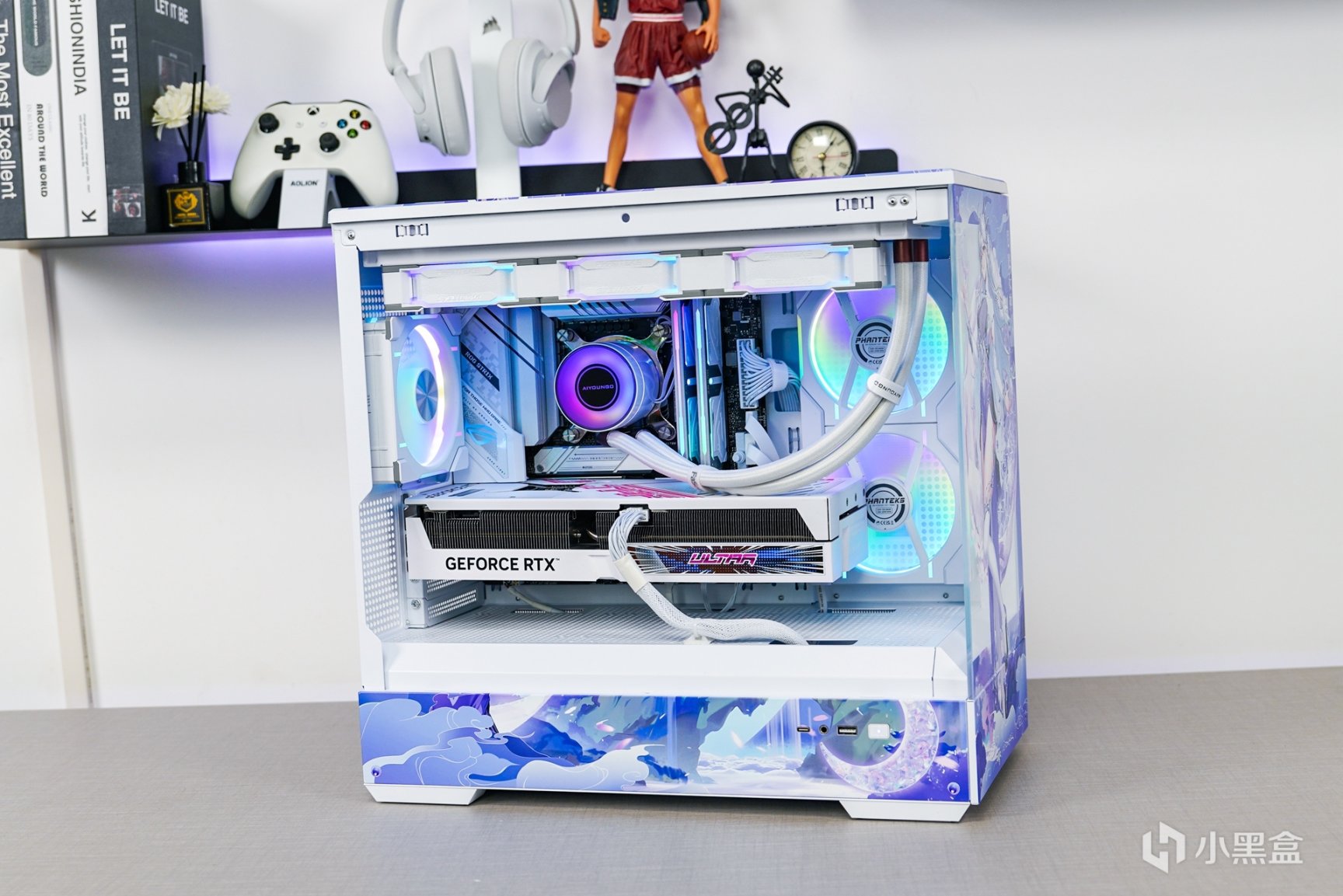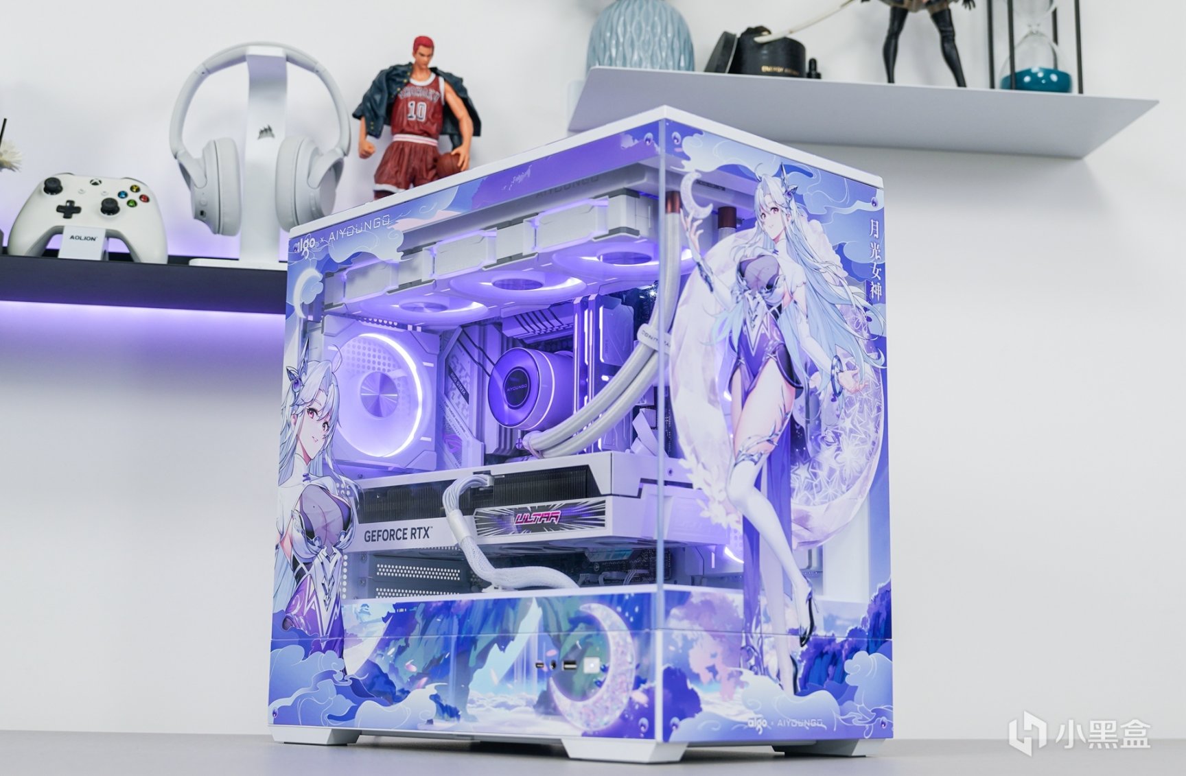 随着次元文化的不断发展与普及,次元文化已经在年轻一代中非常的普及,随着越来越多的本土化次元文化的兴起,原创的国风IP融入主机外观上,不但让主机外观更有辨识度,还可以更好的展现和表达更具个性化的主题。这次以国风IP—月光女神为主题(AIGO为了星璨岚所推出的虚拟次元人物)的主机安装完成后,浅蓝、浅紫和白三组色调的图案主要是为了突显整个主机的主题。