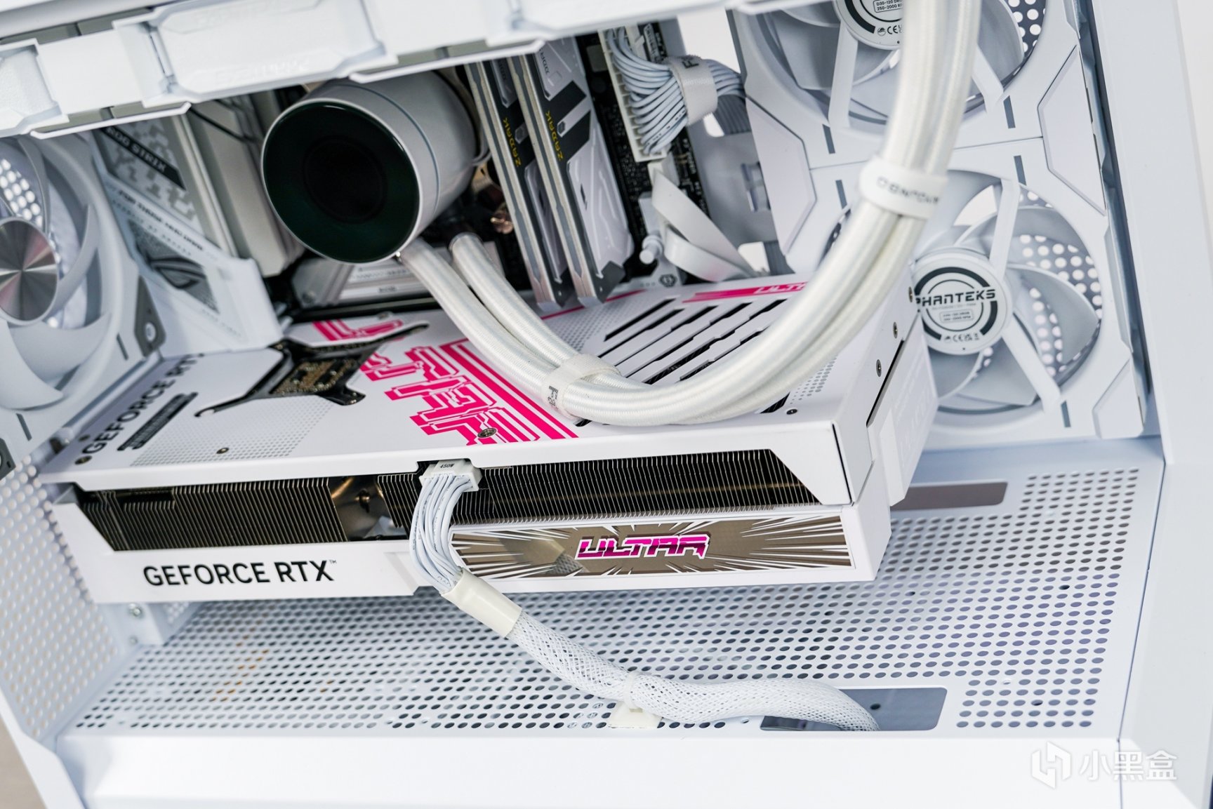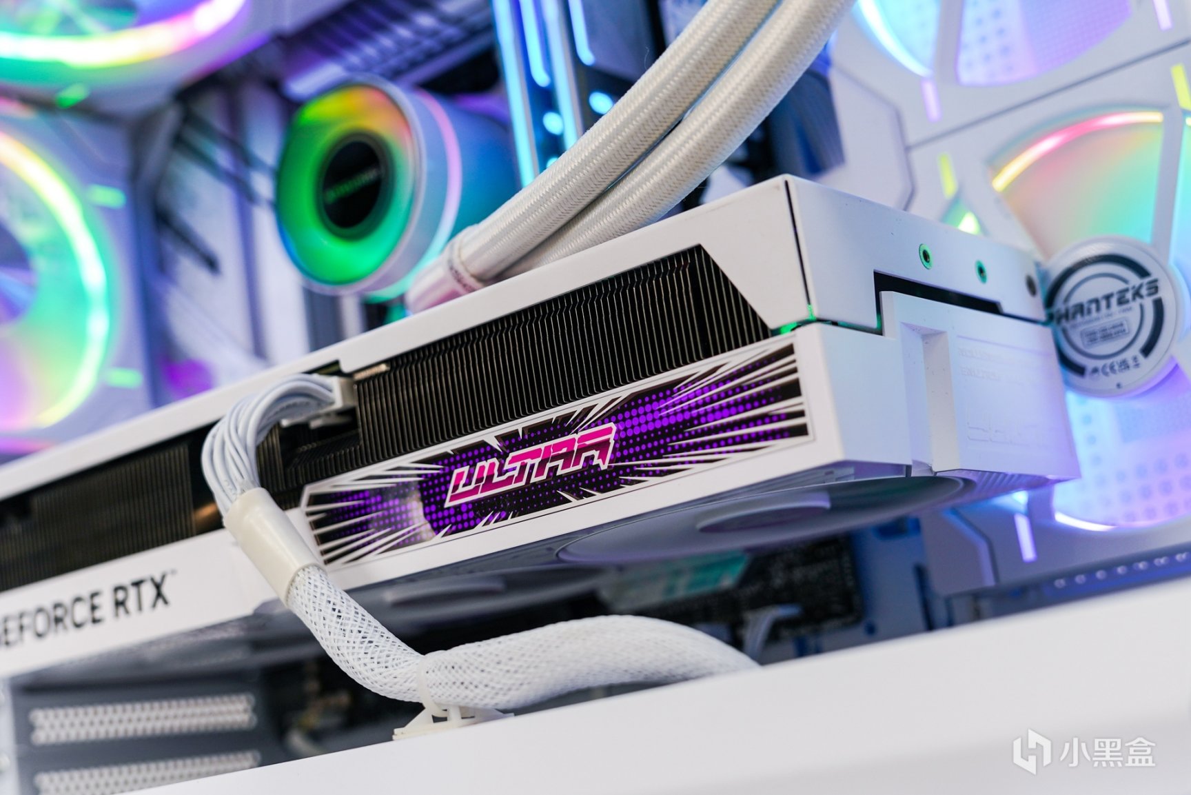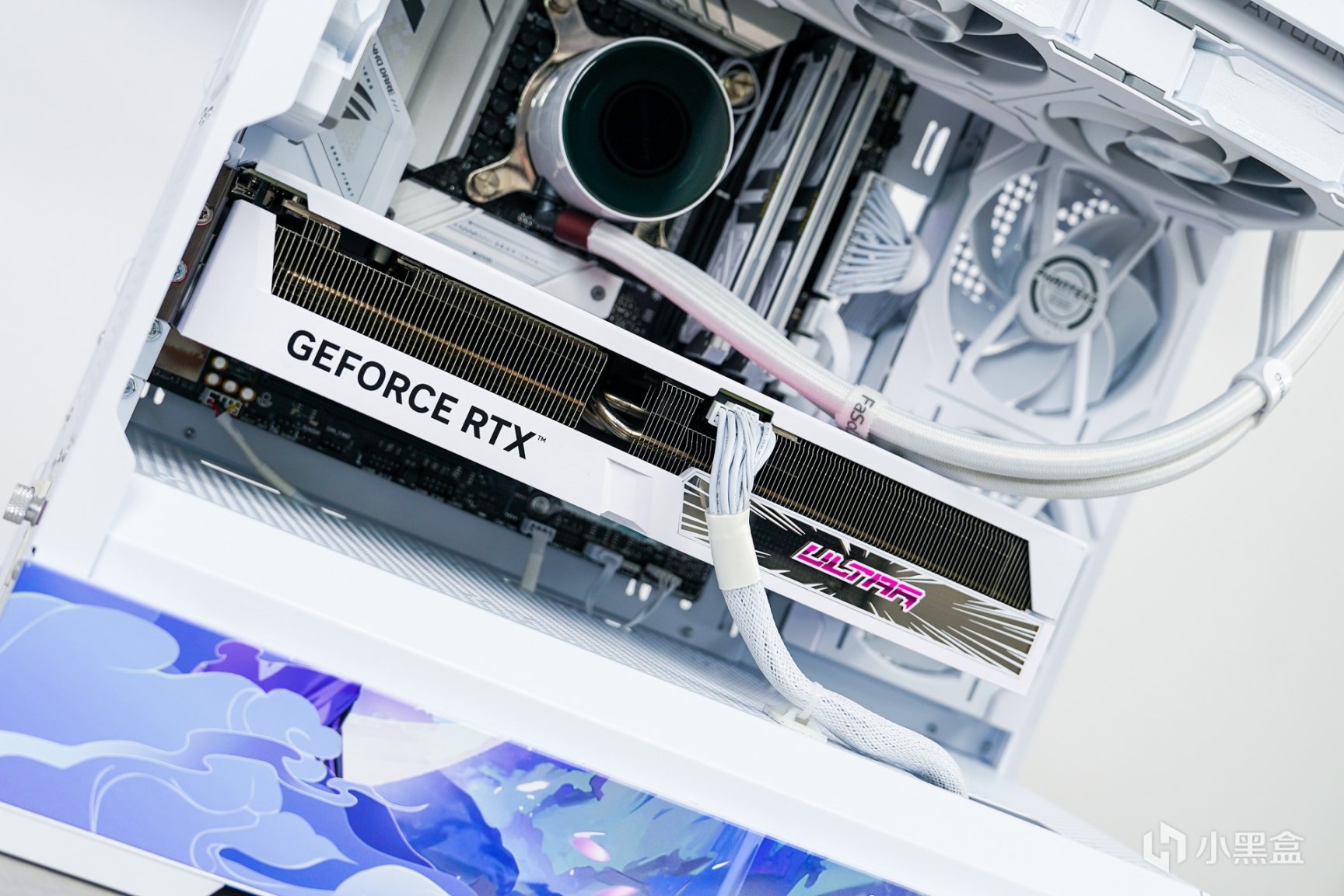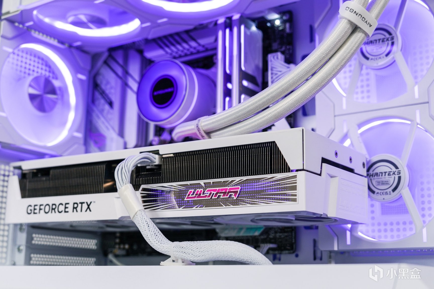 显卡部分:七彩虹RTX 4070Ti Ultra W OC V2 ,Ultra W这代已经看不到黑色版了,而是全线定位为白色系显卡,而40系显卡除了性能的提升之外,在外观上也带来了不少的变化:散热外壳是从新设计的,散热外壳主色调是以白色搭配波普视觉艺术,并添加上浅色蓝紫的渐变色印刷,在不同角度下可在淡蓝和淡紫色之间切换转变来达到渐变的效果。显卡散热上采用了三个环型100mm扇叶三风扇设计,扇叶转轴使用了双滚珠轴承设计,更大面积的散热鳍片将加速导热效率,其中包括6x6mm热管搭配“回流焊”工艺使热管与鳍片紧密接触,从而优化散热效果来压制这张功耗280W的OC显卡应该是绰绰有余的。加上侧面前段的波普概念设计的ARGB发光区域衬托。