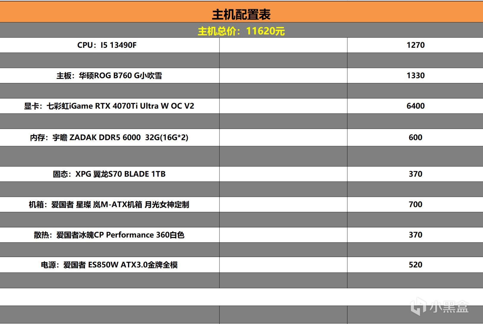装机展示后,各位应该更关心主机的整体价格和硬件搭配是怎样的吧,那么我也弄了份表格再来看下这次装机硬件配置以及价格让大家做个参考。